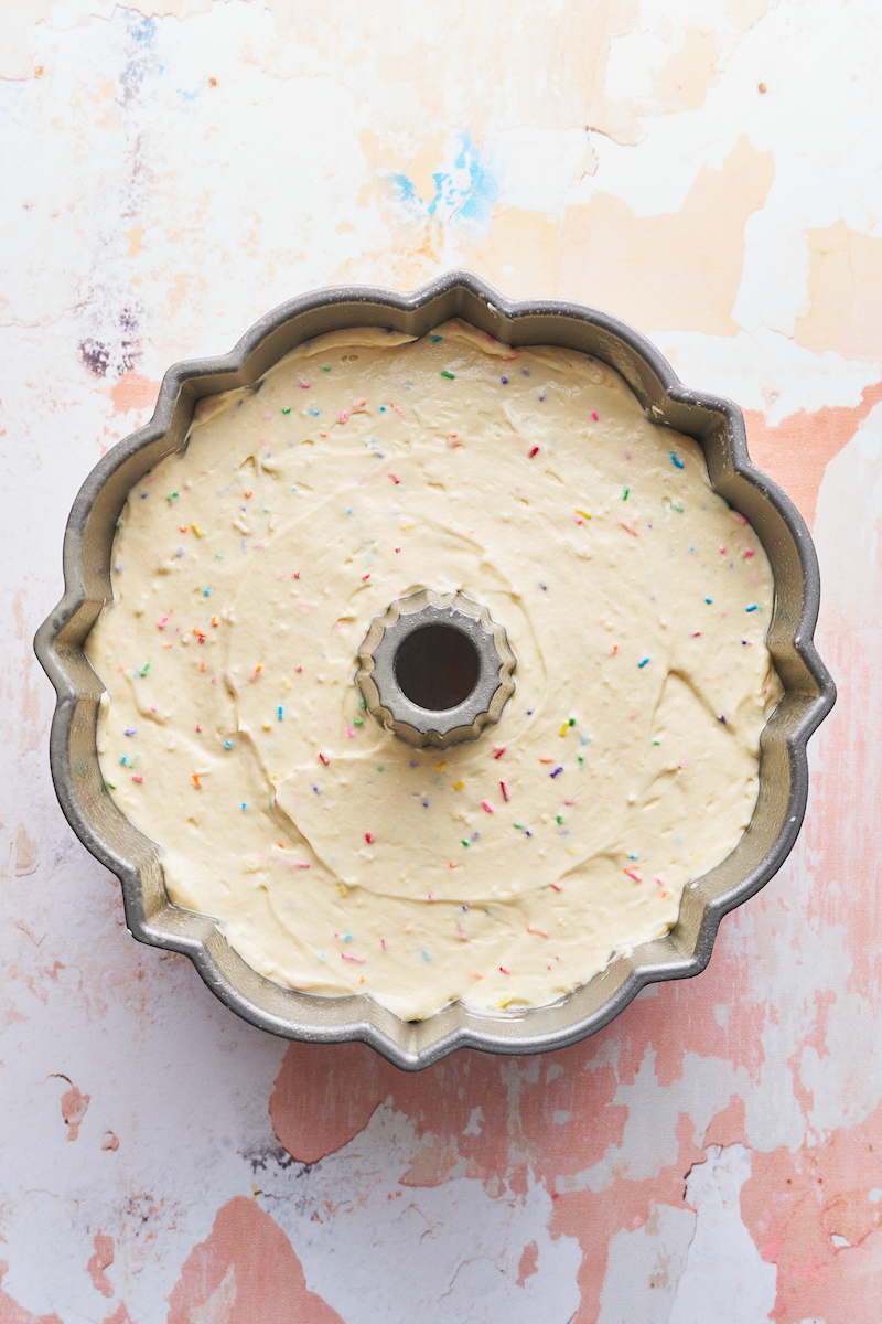 - Grease your bundt pan RIGHT before adding the batter! Why? Because if you spray it at the beginning of assembly, the spray has time to drip from the edges, leaving parts of the pan unprotected. So spray right before you scrape the batter into the pan. And be sure to spray every nook and cranny!
