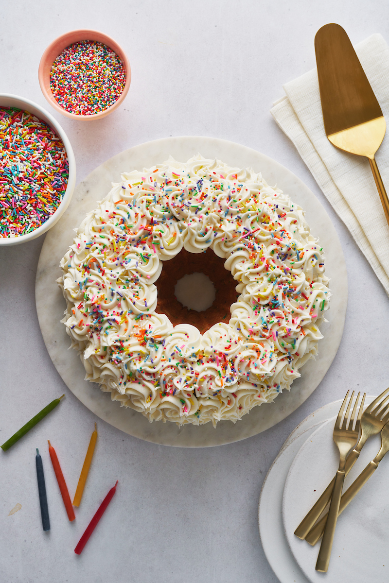 - Spread or pipe the frosting on the top and sides of the cooled cake. Top with sprinkles and nonpareils. Slice and serve!