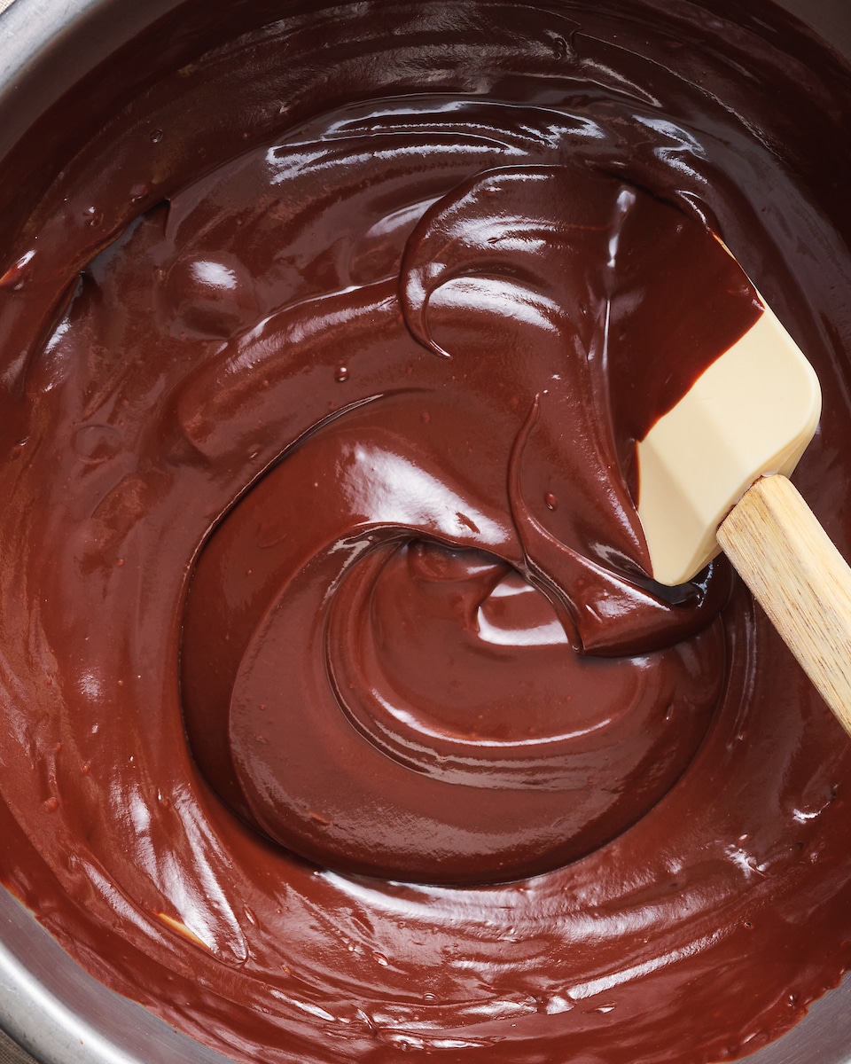 - Pour the hot cream over the chopped chocolate and allow the mixture to sit for a minute. Then whisk smooth!