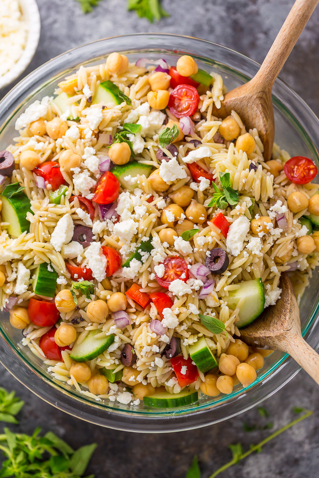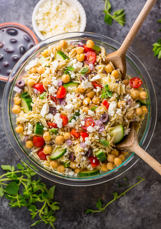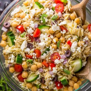 This Greek Orzo Salad Recipe bursts with flavor thanks to feta cheese, red onion, tomatoes, cucumber, and kalamata olives. We use chickpeas for our protein, feel free to use grilled chicken or shrimp instead! Topped with a zesty Greek salad dressing, this is the perfect summer pasta salad recipe. Just combine the ingredients in a large bowl, add the dressing, and toss!