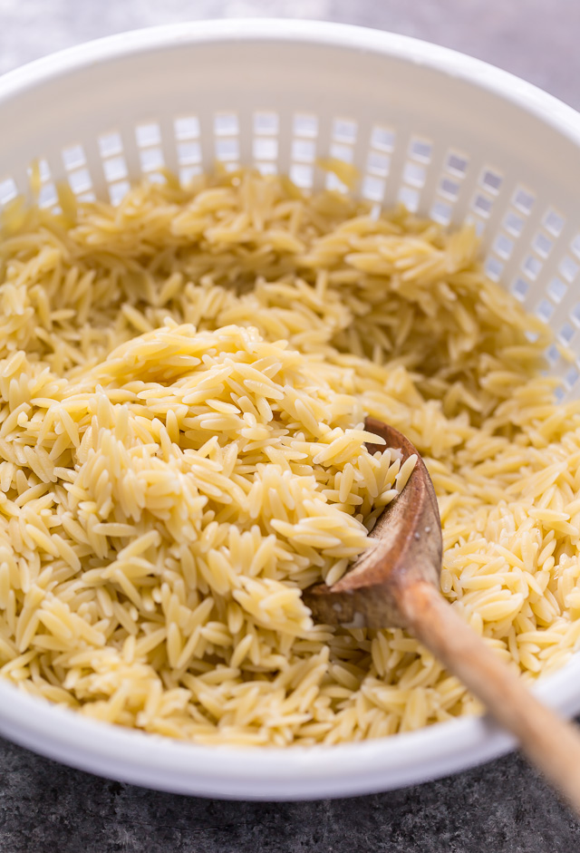 - Drain: You’ll want to drain the pasta right after you cook the orzo, and then rinse it under cold water. Rinsing the orzo with cold water will stop it from cooking any more and cool it off quickly.