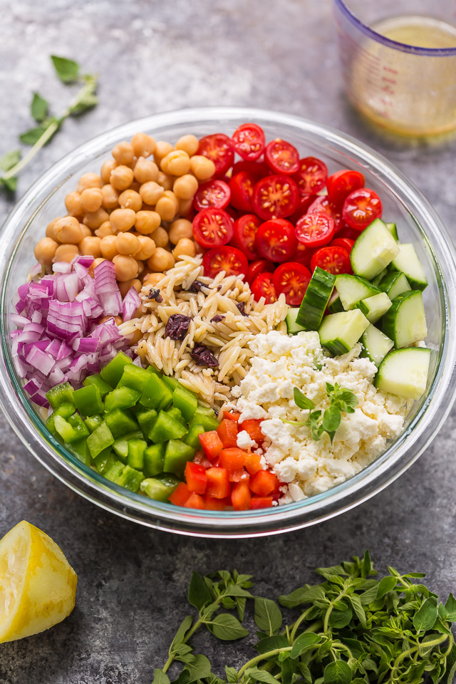 - Add vegetables, olives, chickpeas, and feta to the orzo bowl and mix well to combine. Season with salt and pepper, if desired.