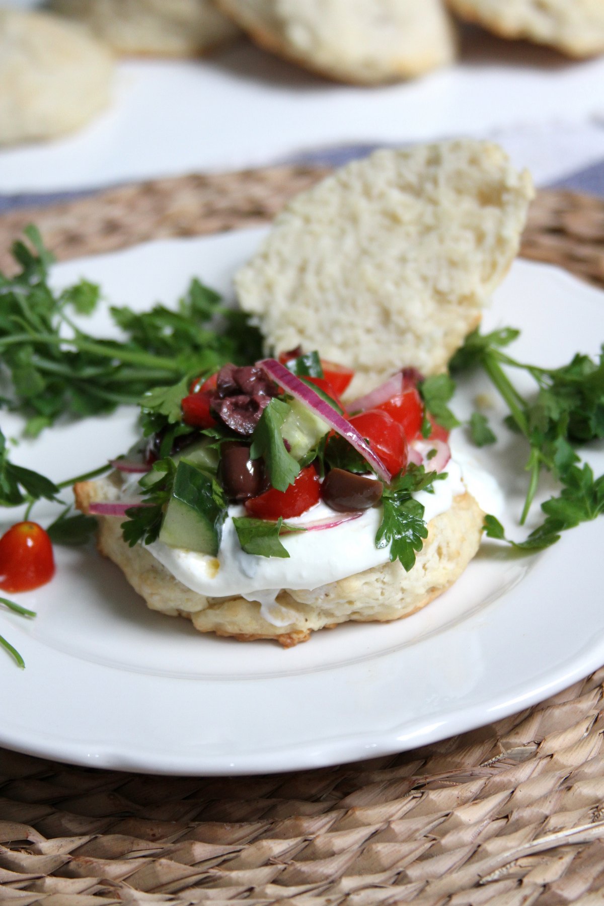Split each biscuit in half, generously slater one side with whipped feta, then spoon on about a 1/4 cup of the greek salad mixture. Aaaaaand Eat!