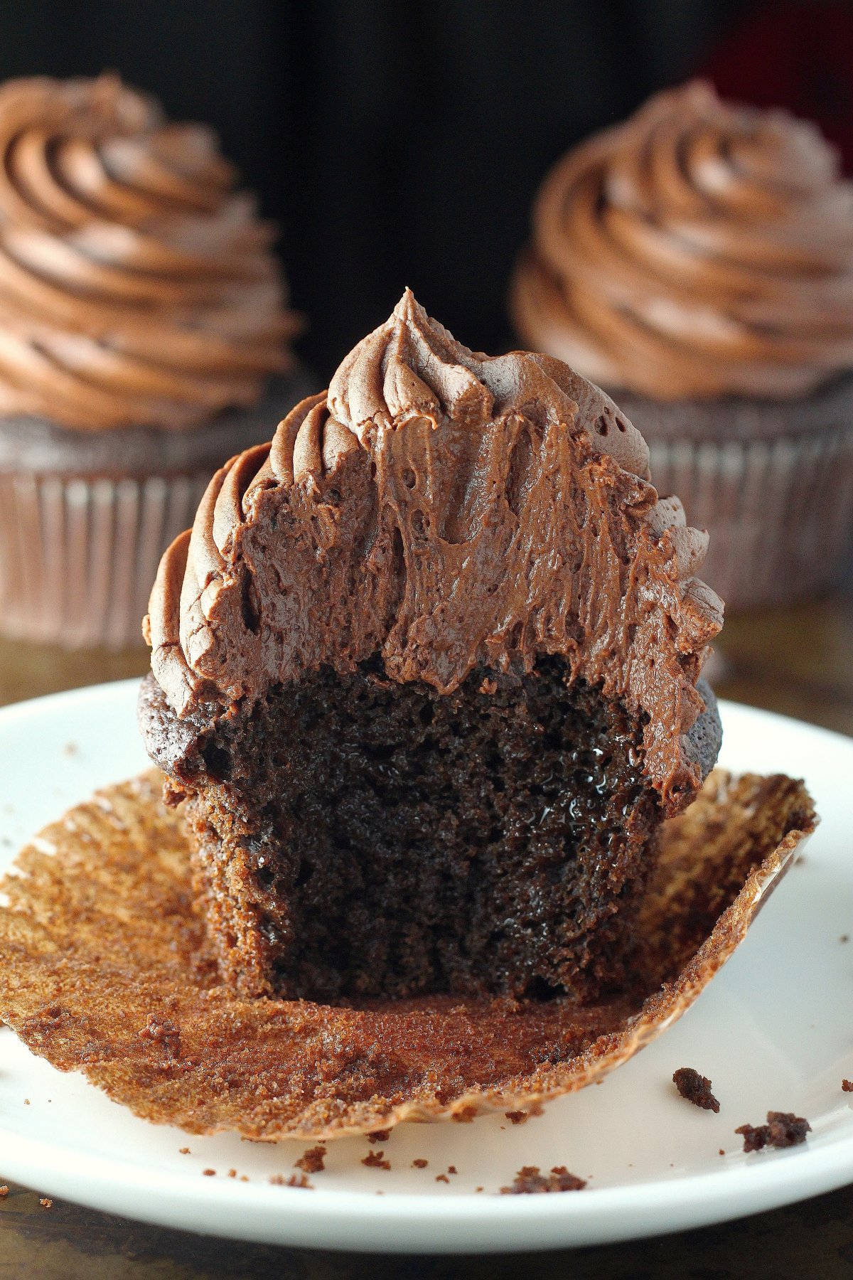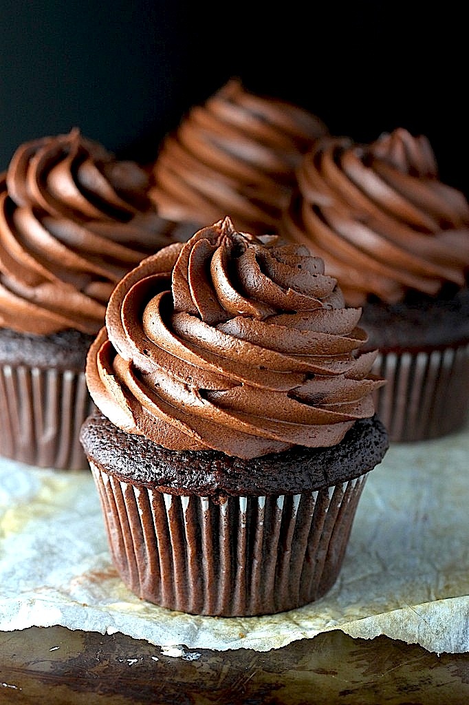 This is a great recipe for when you’re looking for something a little more exciting than your standard chocolate cupcake recipe, and a little easier than making a super decadent chocolate fudge cake with chocolate fudge frosting. Moist, rich, and topped with the most addicting chocolate buttercream ever (trust me; you won’t be able to stop “taste testing”).