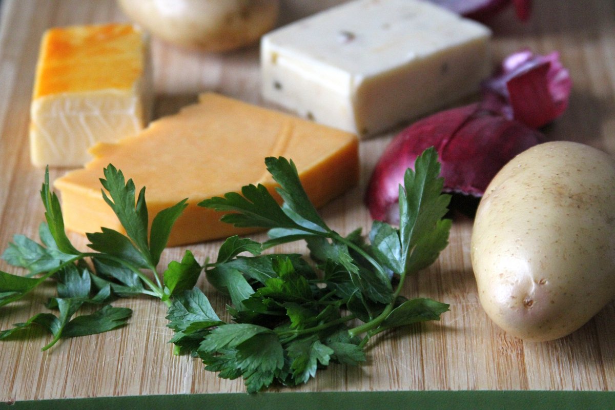 Melt one tablespoon of butter in a large skillet over medium heat. Add red onion and saute for 25-30 minutes, or until the onion is begin to caramelize. Add the sliced chorizo, potato, and corn kernels – mixing well, and increase the heat to medium high. Add the last tablespoon of butter, and cook for about 10 minutes, or until the potatoes are crispy on the outside but easily pierced with a fork. Add 1/2 of the cheeses, and all of the herbs, mixing well. Cook for another 2-3 minutes, or until the cheese has melted and things are looking good! Remove pan from heat and taste to see if it needs any additional seasonings (salt, pepper, crushed red pepper flakes all made it into mine).