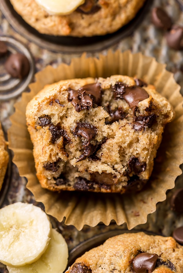 Healthier Banana Chocolate Chip Muffins are extra moist thanks to ripe bananas and honey! Whole wheat flour and protein packed Greek yogurt make them perfect for breakfast – or as an afternoon snack. Use dark chocolate, semi-sweet chocolate, or mini chocolate chips for a fun twist!