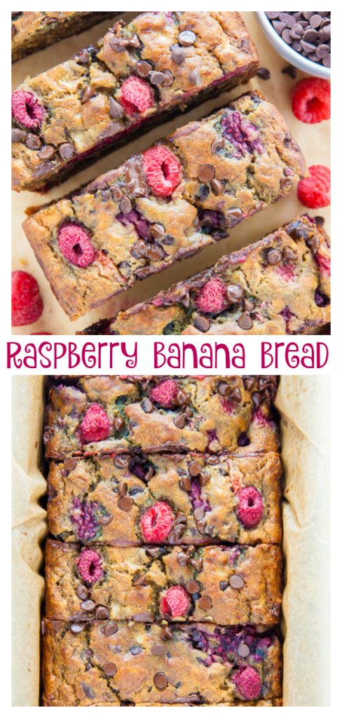 This Healthy Raspberry Chocolate Chip Banana Bread is an easy treat the whole family will love! Loaded with juicy raspberries and mini chocolate chips, this is a fun and healthy twist on classic banana bread. Yum!