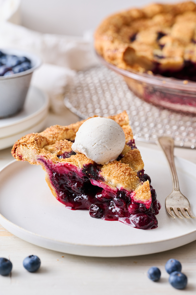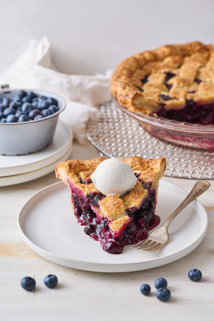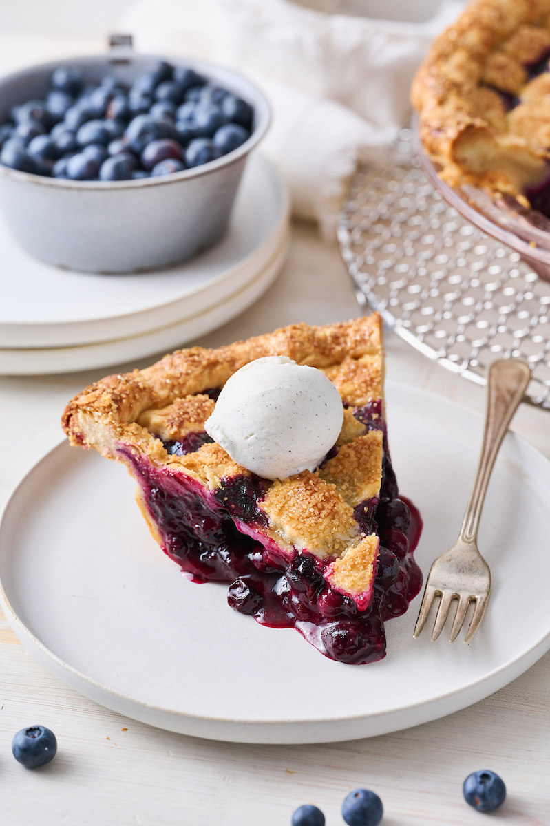 More specifically, homemade blueberry pie topped with vanilla ice cream! After cherry pie, it’s my absolute favorite summer dessert recipe! Because I can’t find a decent store-bought blueberry pie to save my life. They’re either soupy, too thick and gloopy, or sickly sweet.