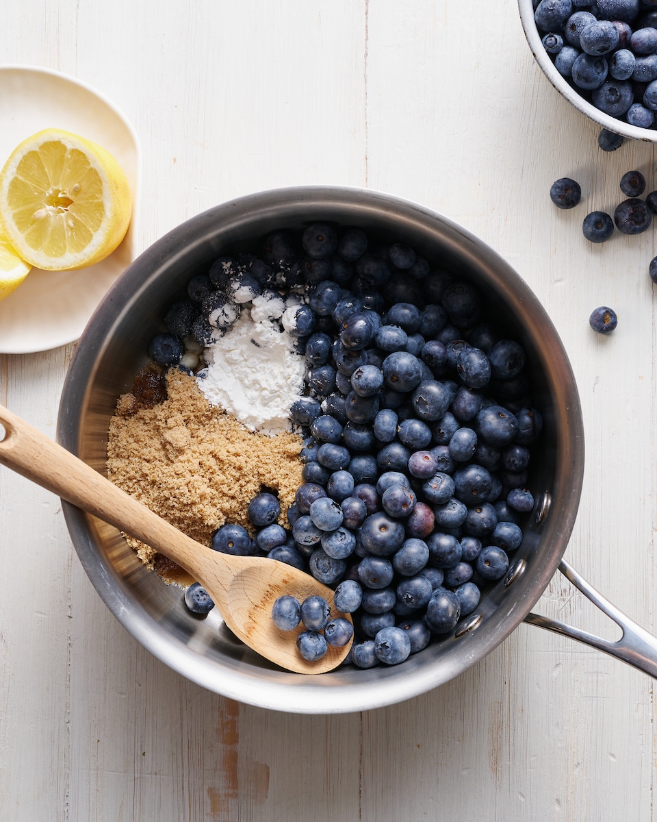 - In a medium saucepan, combine the 1 pound (397 g) of the blueberries, light brown sugar, lemon juice, and 1 Tablespoon (11 grams) of the cornstarch. Place the pan over medium-high heat and bring to a simmer, stirring almost constantly, and cook just until the mixture starts to thicken, about 7 to 8 minutes.