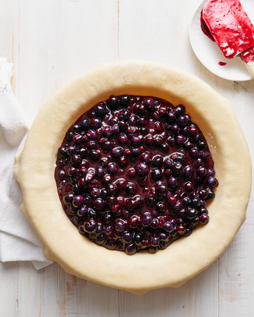 - Sprinkle the bottom of the pie crust with 1 teaspoon of flour. Then, using a rubber spatula, scrape the blueberry pie filling into an even layer in the pie crust shell.