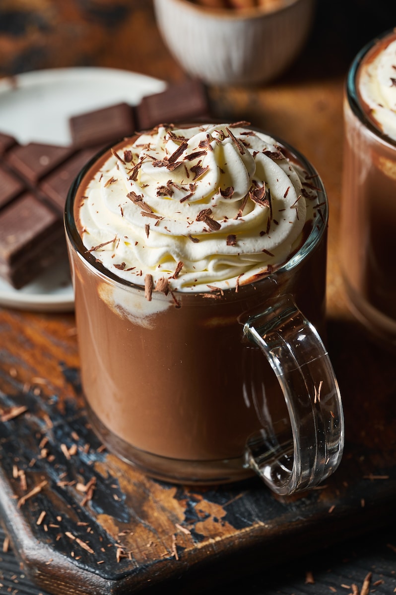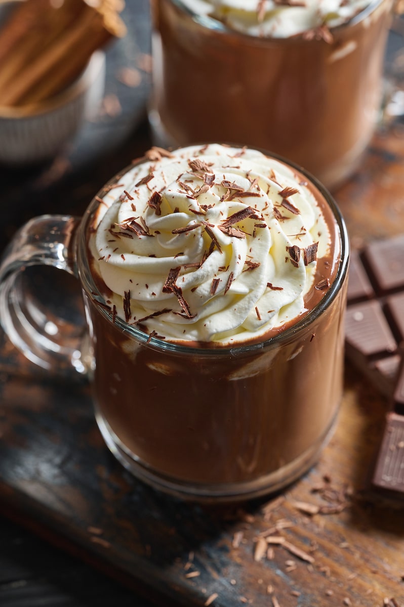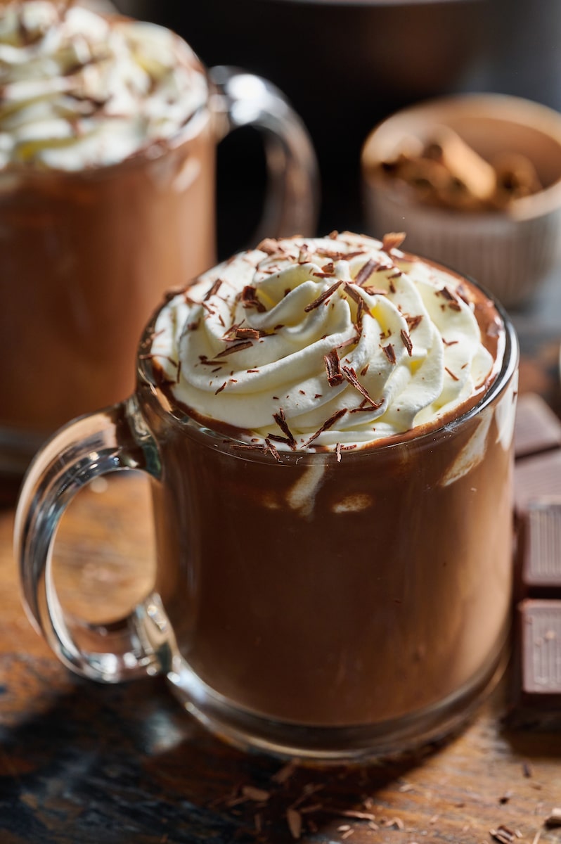 - Ladle into mugs. Garnish with lots of whipped cream and shaved chocolate, if desired. Serve at once!