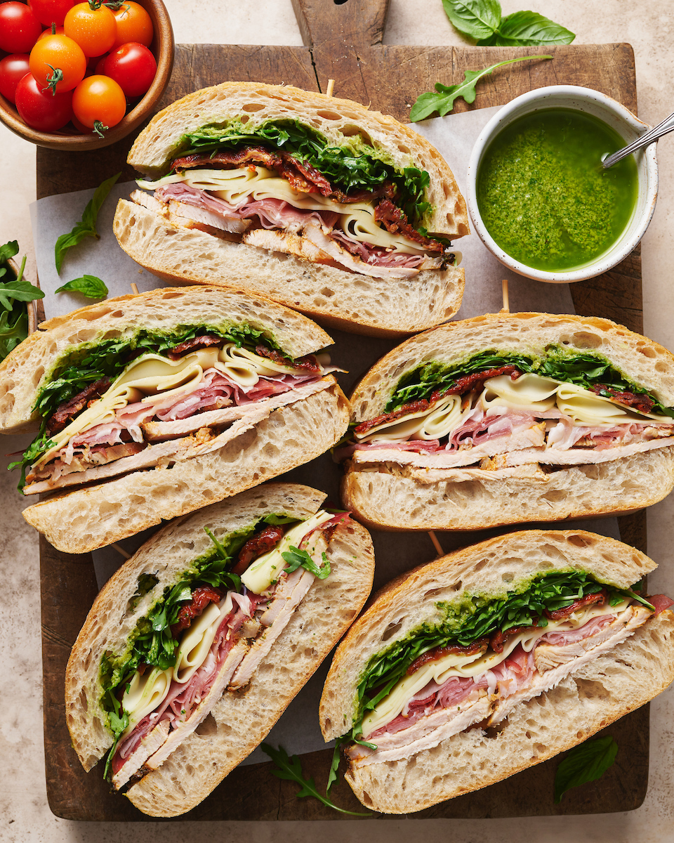 Goodbye classic club, hello crowd-pleasing Italian turkey club sandwich! Perfect for picnics, parties, or those nights it’s too hot to cook. Loaded with sliced turkey (or chicken), prosciutto, arugula, sun-dried tomatoes, and a homemade Italian dressing. This recipe is so flavorful and fresh.