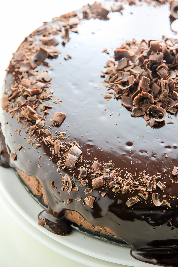- Place the springform pan in a large baking pan (with high sides) and fill the pan halfway with hot water; this is your water bath (see post if you need more information on this). Place cheesecake in preheated oven and bake for 1 hour and 30 minutes. Turn the oven off and let the cheesecake sit for 45 minutes inside the oven with the door shut. The cheesecake should be still slightly wiggly in the center. Remove from oven and gently run a knife around the edge of the cake, loosening any bits that may have gotten stuck while baking. Allow cheesecake to rest on the counter for 30 minutes before covering with plastic wrap and refrigerating for at least 6 hours. When ready to serve pour the ganache on top of the uncut cheesecake and place it back in the fridge for 10 minutes (this will help the ganache set). Slice, top with a dollop of whipped cream, and serve!