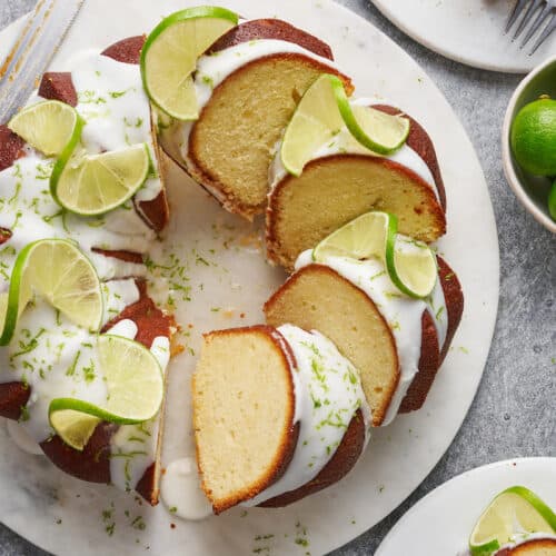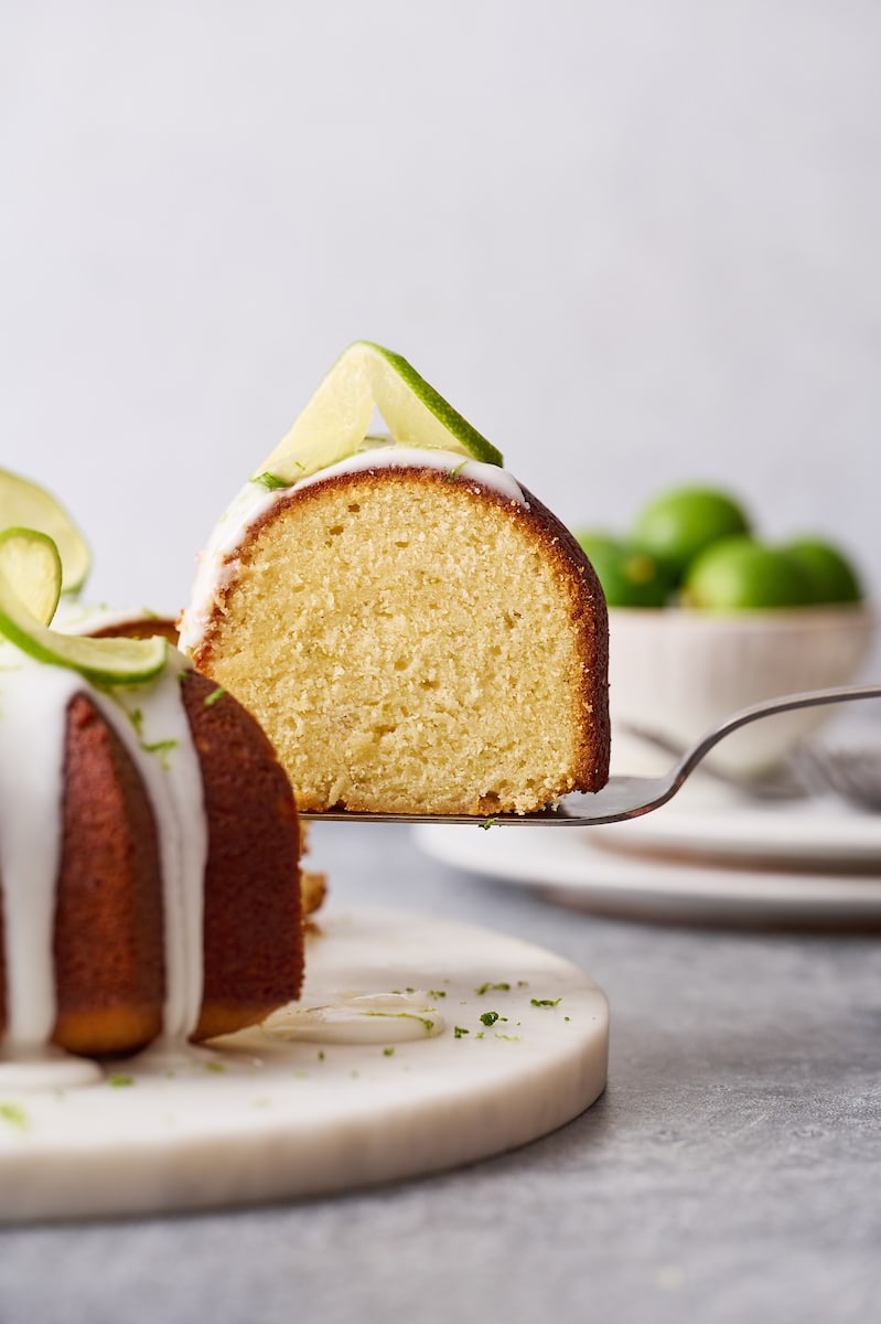 Speaking of garnishes, you have plenty of options here! I love adding finely grated lime zest and lime spirals, but you could also add crushed graham cracker crumbs for a key lime pie vibe. You could also swap out the glaze for a cream cheese frosting like I use on my bakery-style white cake (tastes like white cake mix but a million times better) or a white chocolate frosting like I use on my white chocolate cranberry bundt cake.