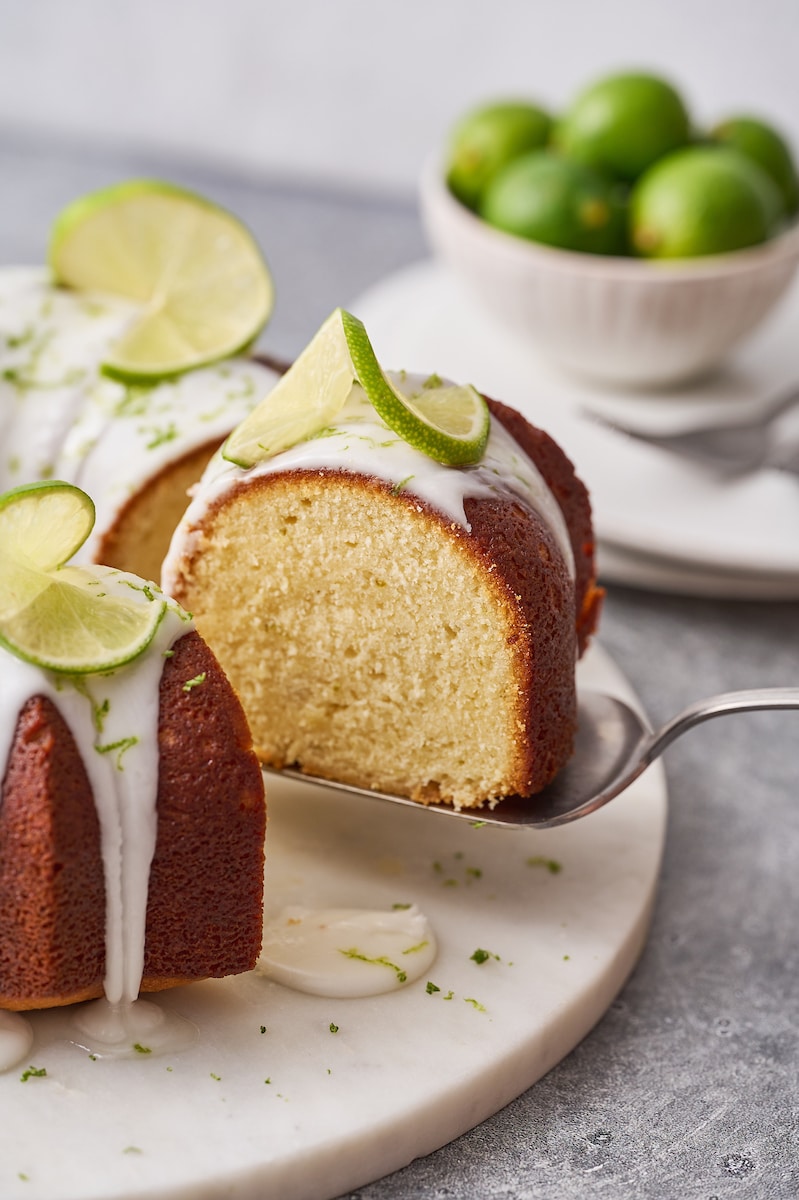 - Drizzle the glaze over the cooled cake. Decorate with lime zest and lime spirals, if using. Then allow it to set for 20 minutes. Slice and serve!