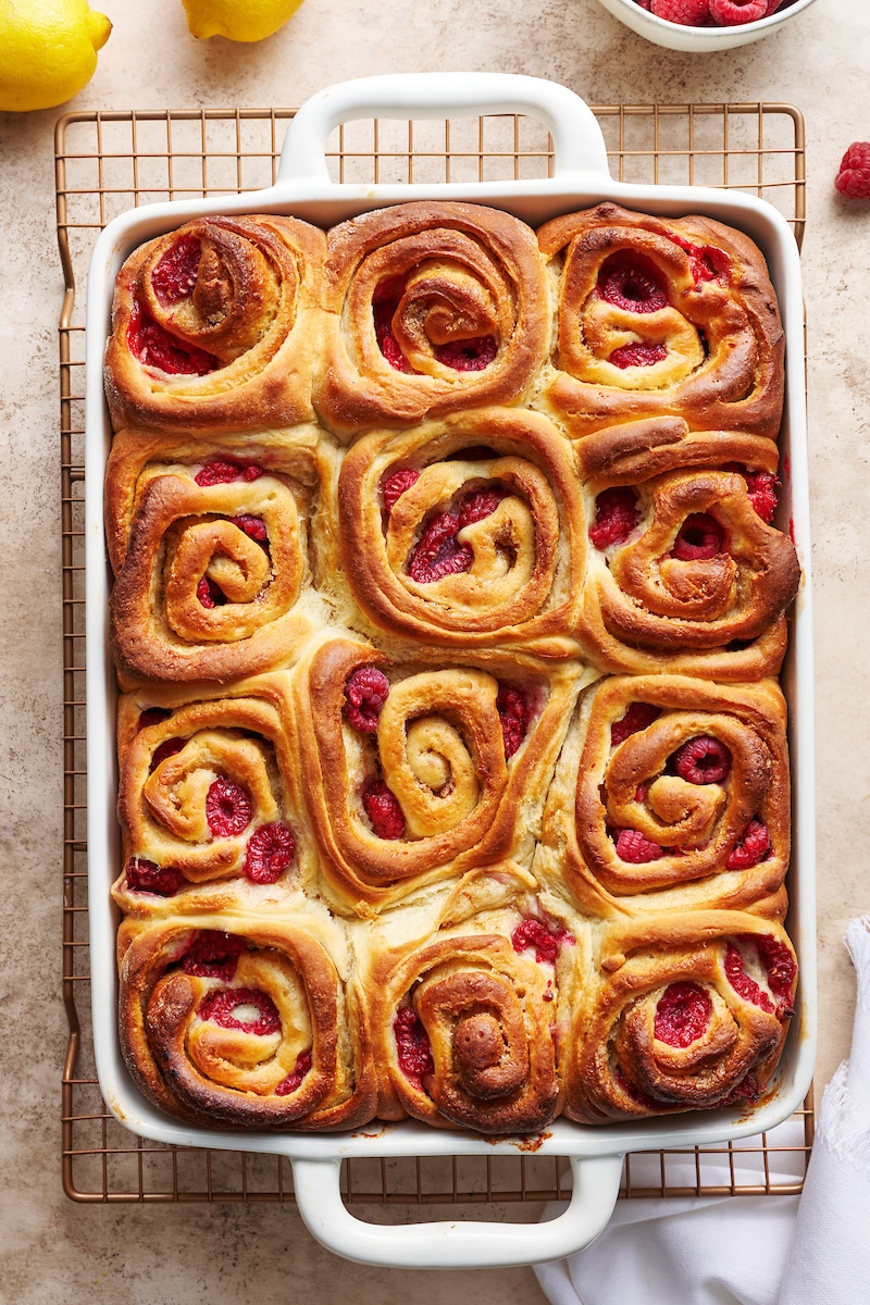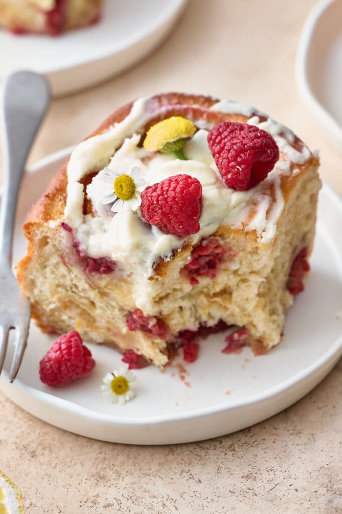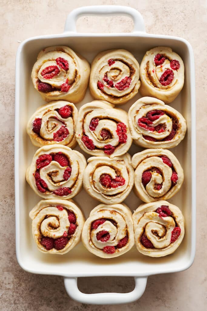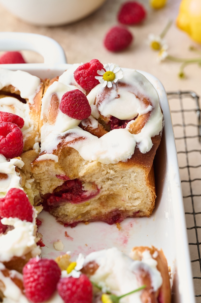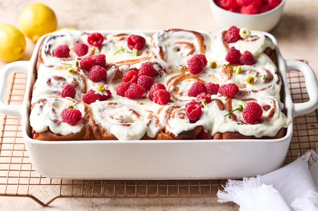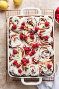 A little lemon zest in the dough, filling, and frosting adds just the right amount of lemon flavor to these rolls. And the white chocolate frosting features fresh lemon juice, which adds even more delicious lemon flavor. Because we all know lemon + raspberry = a flavor combo made in heaven!