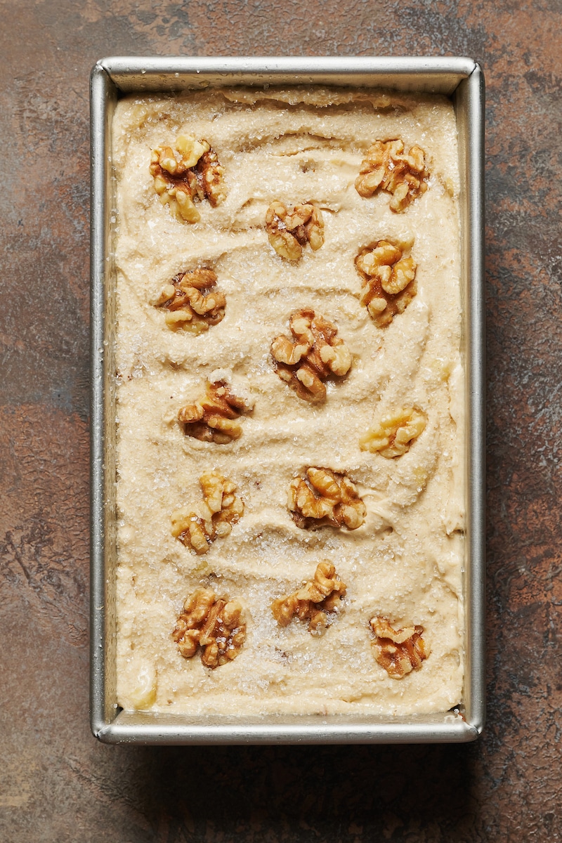 - Make the Banana Batter: Do not over mix your batter! You want to mix the ingredients just until they come together and make a smooth dough. Then scrape everything into the baking pan. At this point you can sprinkle with sparkling sugar and add some extra walnuts on top, if desired.