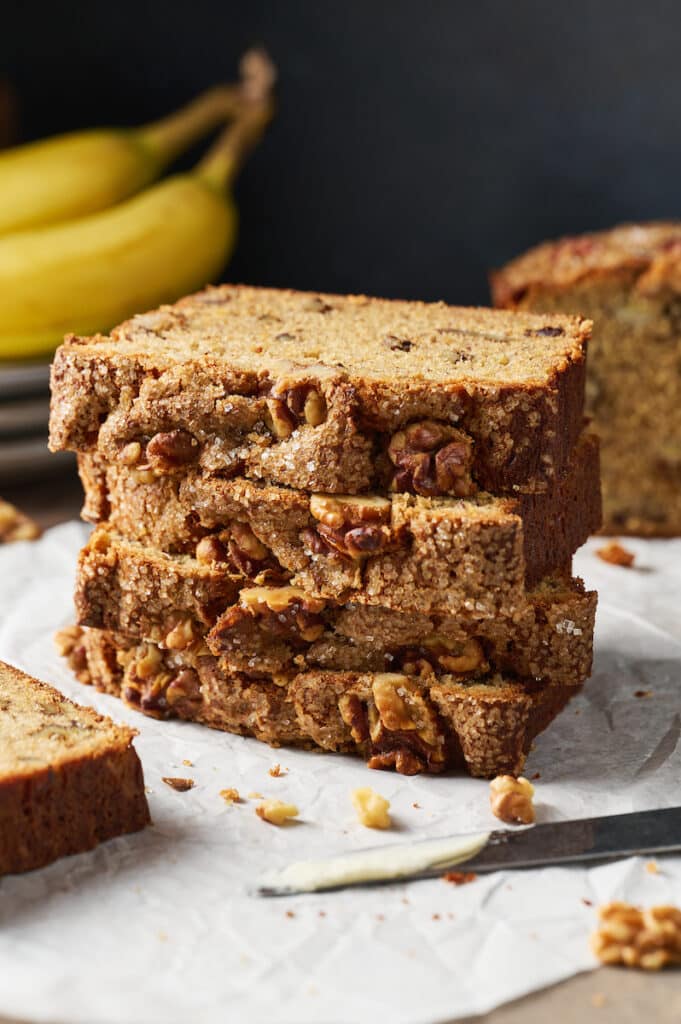 We almost always have ripe bananas in our kitchen. And we all know ripe mashed bananas have one purpose in life: BANANA BREAD! Thankfully, my family has BIG banana bread energy! And we’re all fully obsessed with this maple banana quick bread. As soon as I see my bananas are starting to get tiny black spots, my first thought is: “yay! I get to bake maple walnut banana bread again soon!” It’s just that good.
