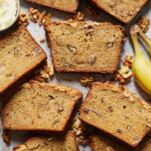 I love slathering a warm slice with melted butter while the coffee is brewing. While my toddler prefers smashing his into a million crumbs… and then savoring each crumb slowly while he colors. To each their own! Because there’s truly no bad way to enjoy this banana bread.