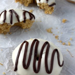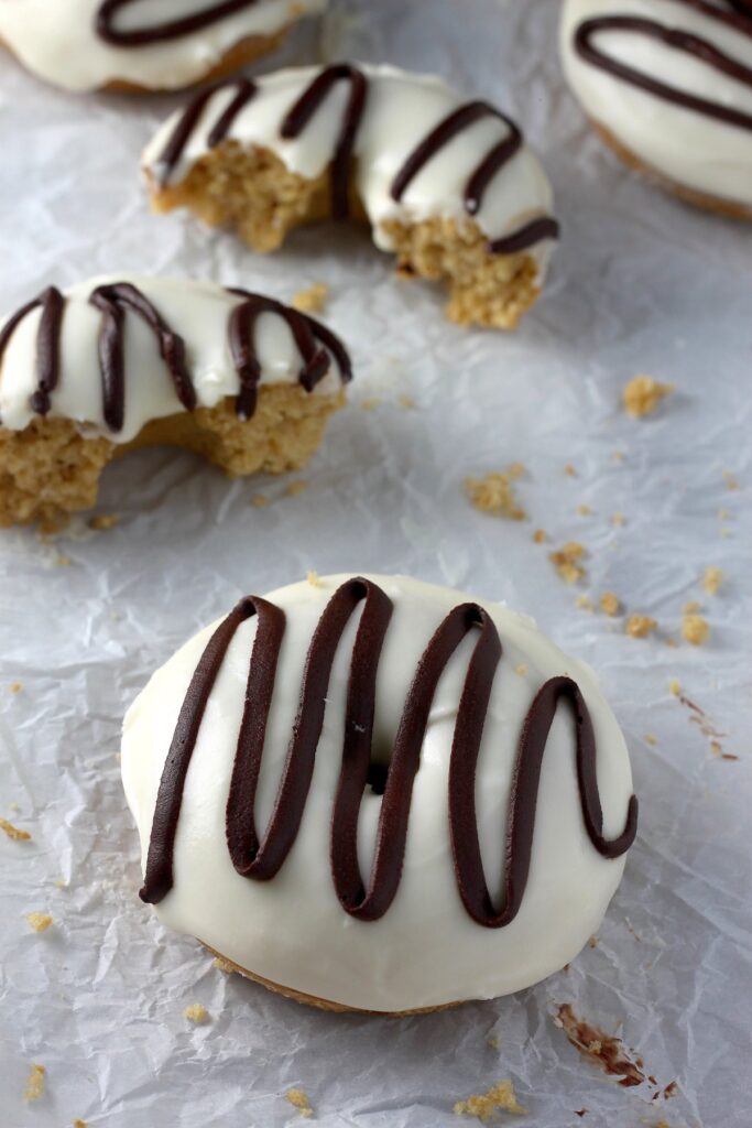 - Once donuts have completely cooled, generously frost the tops of each with the vanilla frosting, then swirl each top with a little (or a lot) chocolate frosting.