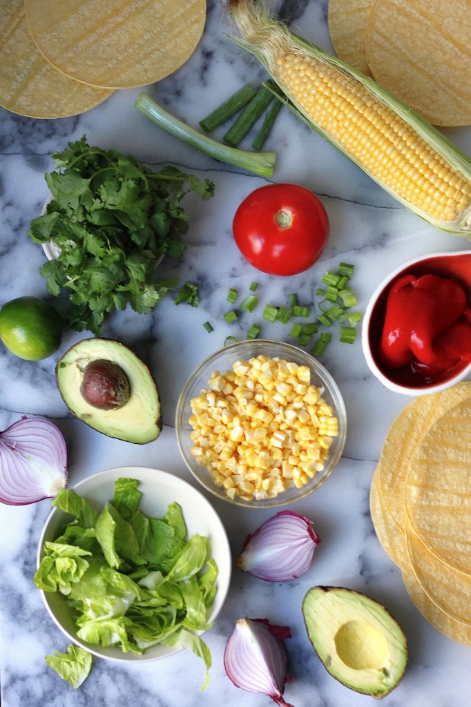 The veggies consist of shredded lettuce, chopped tomatoes, red onion, cilantro, freshly shucked corn, creamy avocado, and roasted piquillo peppers. So bright! And full of taste and texture. I especially love the corn // avocado contrast. Creamy meets crunchy… it’s a dream.
