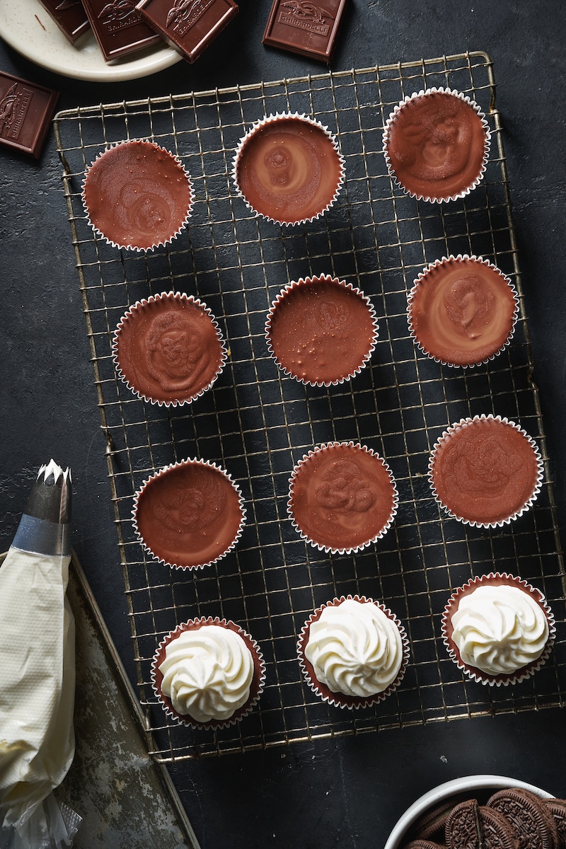 - Make the Pie Shell: Line a muffin pan with paper liners, then fill the liners with the Oreo cookie crust mix. Freeze the crust while you make the filling. No need to cover them with plastic wrap.