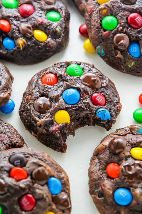 Thick, chewy, M&M Cookie Perfection! Bursting with sweet buttery flavor and exploding with M&Ms, these bite-sized treats are a dreamy addition to any dessert spread. We like to eat them fresh from the oven, but you could also freeze them and use them as the base for an ice cream sandwich situation 😉 I say do BOTH. And Enjoy! xoxo