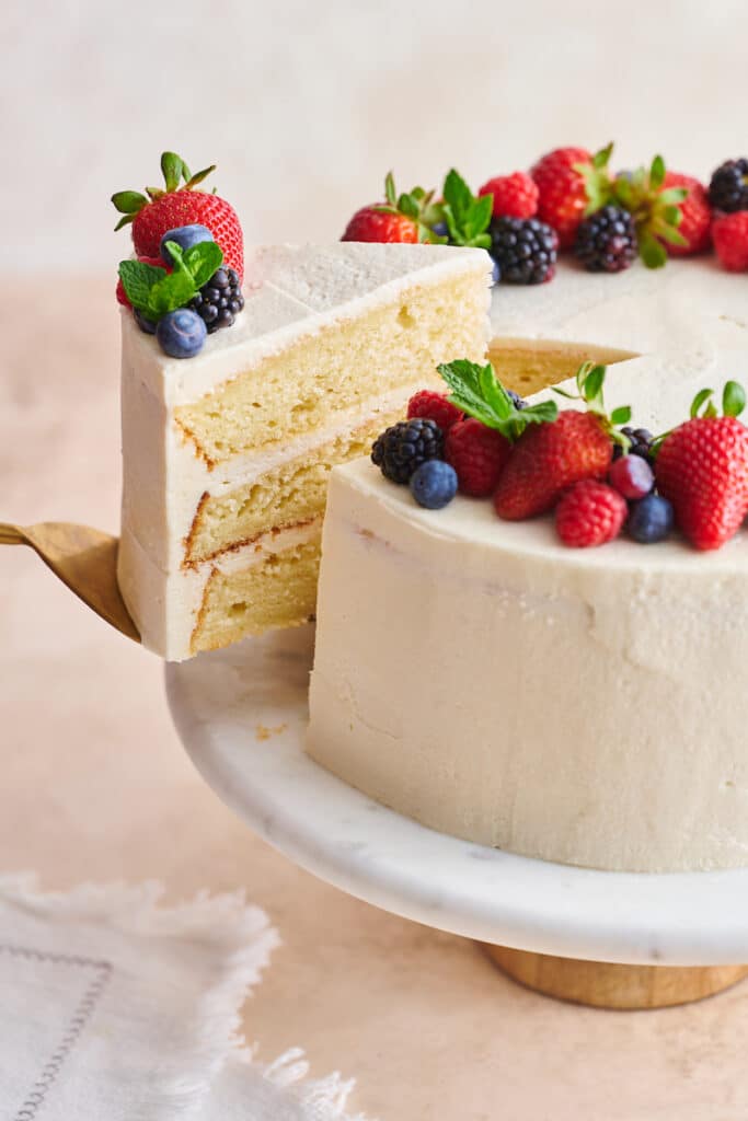 - Once your vanilla cake layer are cool, it’s time to frost! As you can see, this recipe is not super heavy on the frosting. I prefer to let the cake’s pure vanilla flavor shine. But for a thicker layer of vanilla buttercream, simply double the recipe and use it all when frosting the cake.