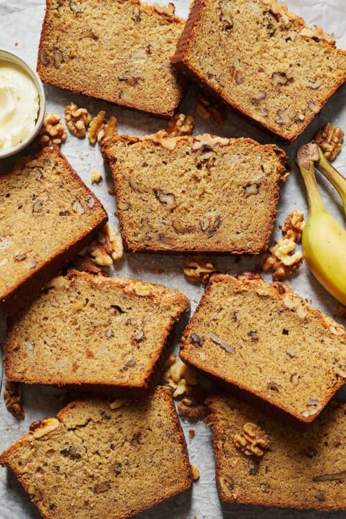 Our favorite banana bread recipe! I use butter to grease my pan in place of the parchment paper, and I often use muffin pan instead of a loaf pan to maximize the amount of servings we get. A loaf is gone in 10 minutes, whereas I can make the muffins last 2 days! I use a 1/4 cup scoop to fill the muffin cavity about half full. Best ever! My whole family LOVES this recipe!