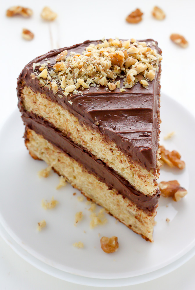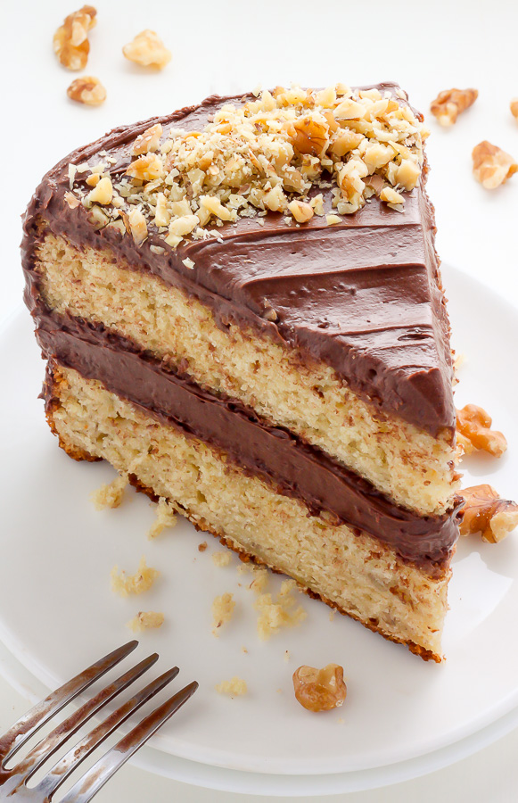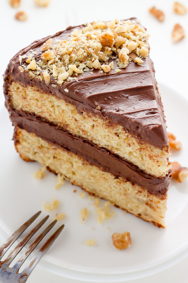 Recently I came to the realization that I’d never shared with you my recipe for old-fashioned banana cake and I literally (and I mean l-i-t-e-r-a-l-l-y) ran into the kitchen to remedy this issue at once! This recipe – which comes from my 93 year old grammy! – for banana cake with super rich chocolate cream cheese frosting evokes so many happy childhood memories that I actually teared up a little while making it… baking it… and finally, eating it. Happy tears, of course. Dessert is powerful like that.