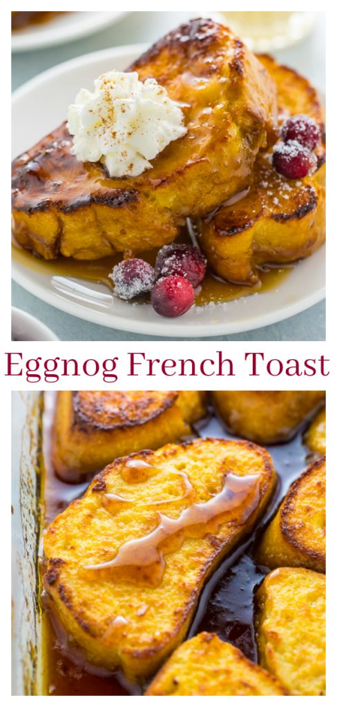 An easy and delicious recipe for Overnight Eggnog French Toast! Serve with sugared cranberries, maple syrup, and whipped cream. The perfect make-ahead breakfast recipe for Christmas morning!