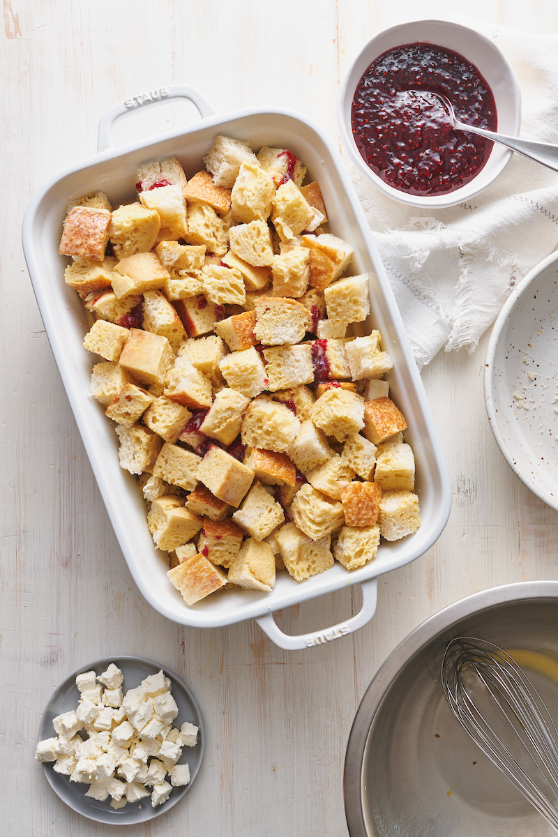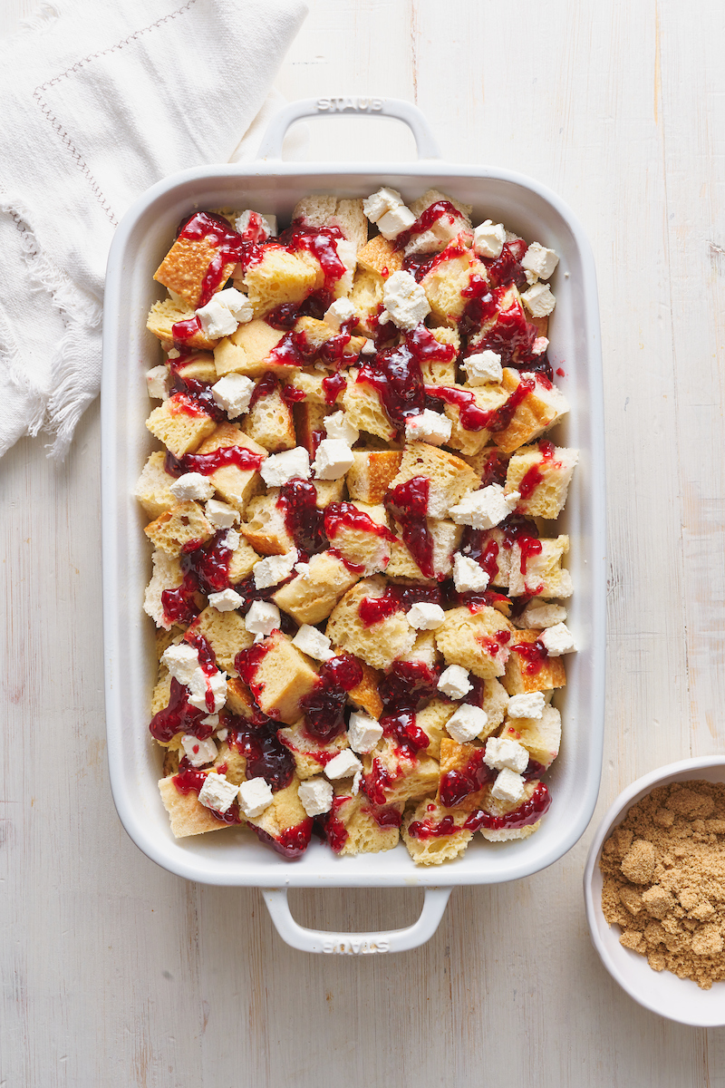 - Place half of the bread cubes into the prepared baking dish. Dollop half off the raspberry preserves on top of the bread, then dot with half of the cream cheese cubes. Top with the remaining bread cubes. Set aside.