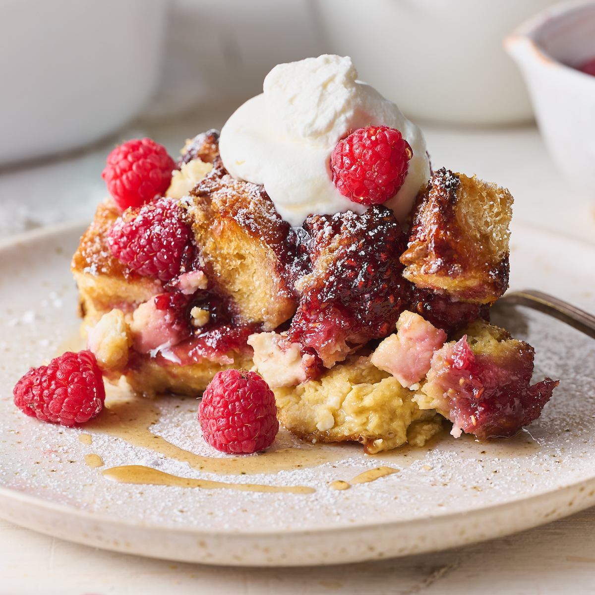 - Serve warm! This is where you can dust with confectioners' sugar, add fresh raspberries, whipped cream, and/ or maple syrup!