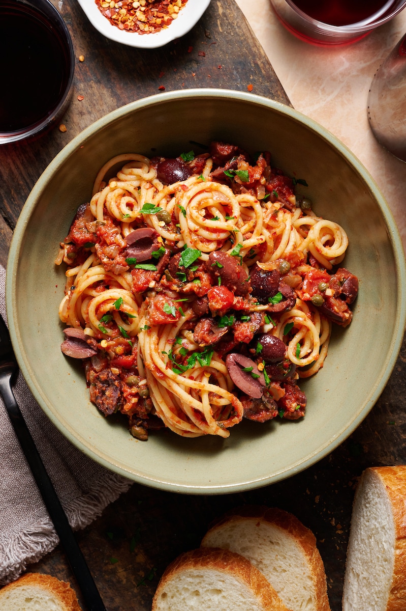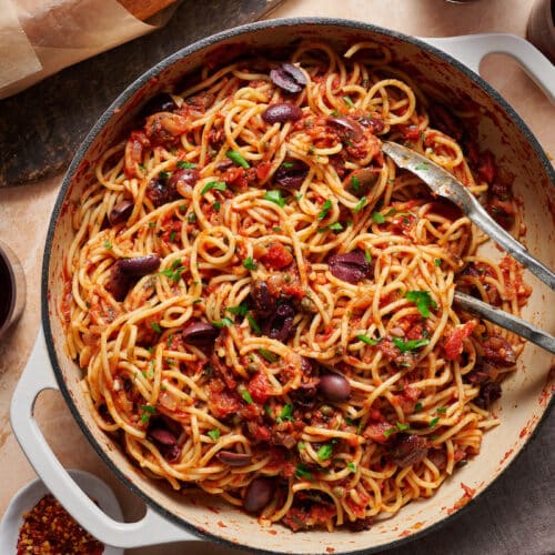 The pasta sauce alone is to-die-for delicious! Layered with olives, anchovies, and capers… it’s exploding with flavor. And comes together quickly – in about the same time it takes to get the pasta water boiling.