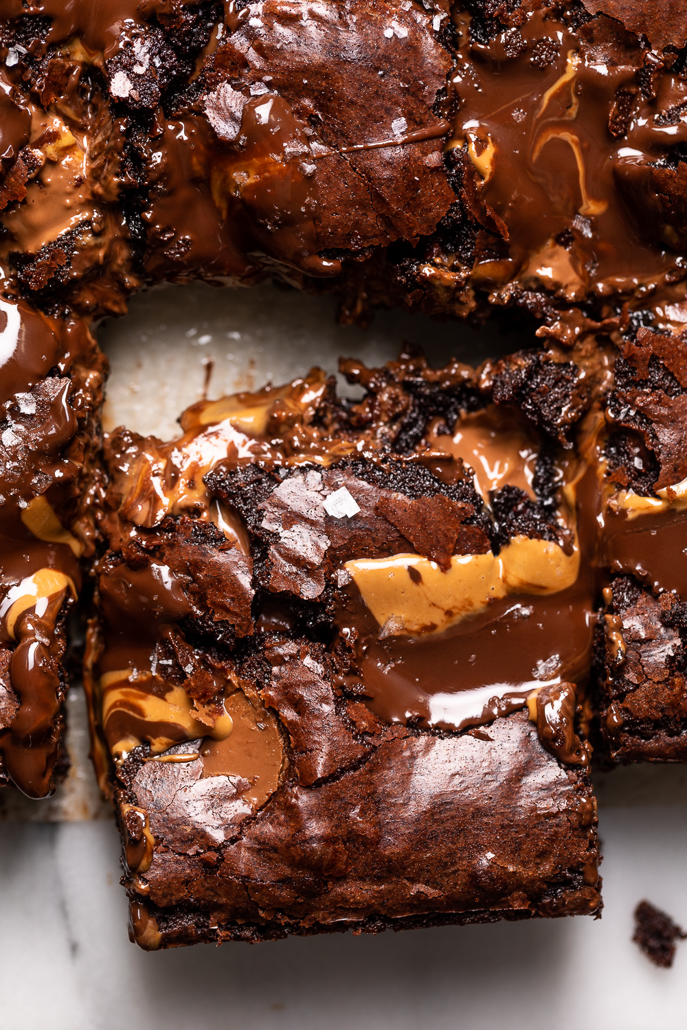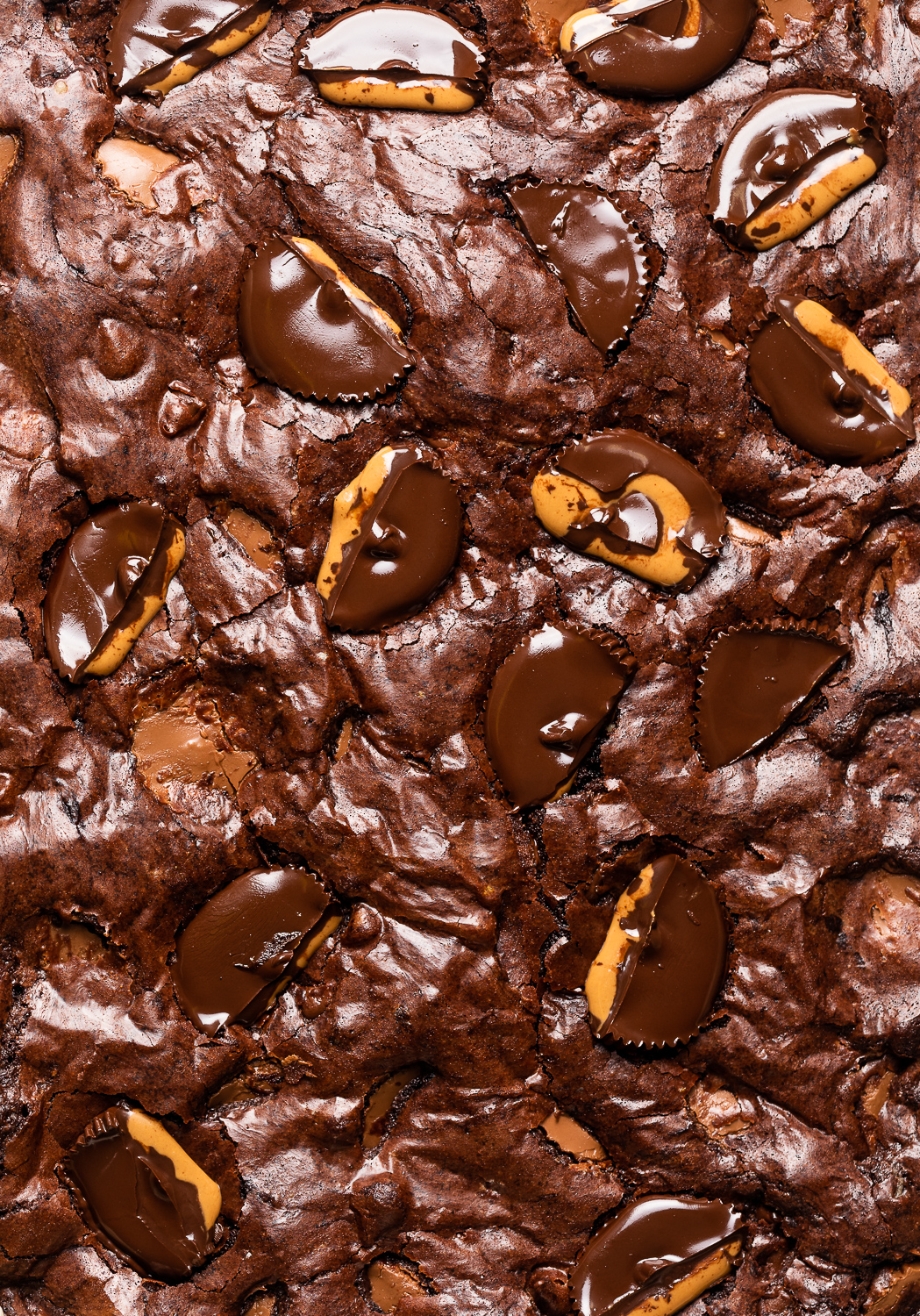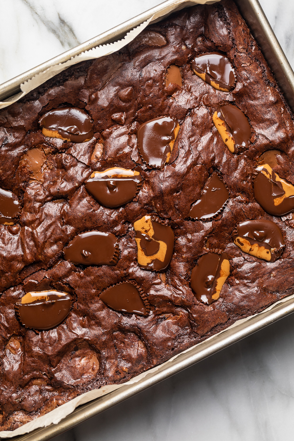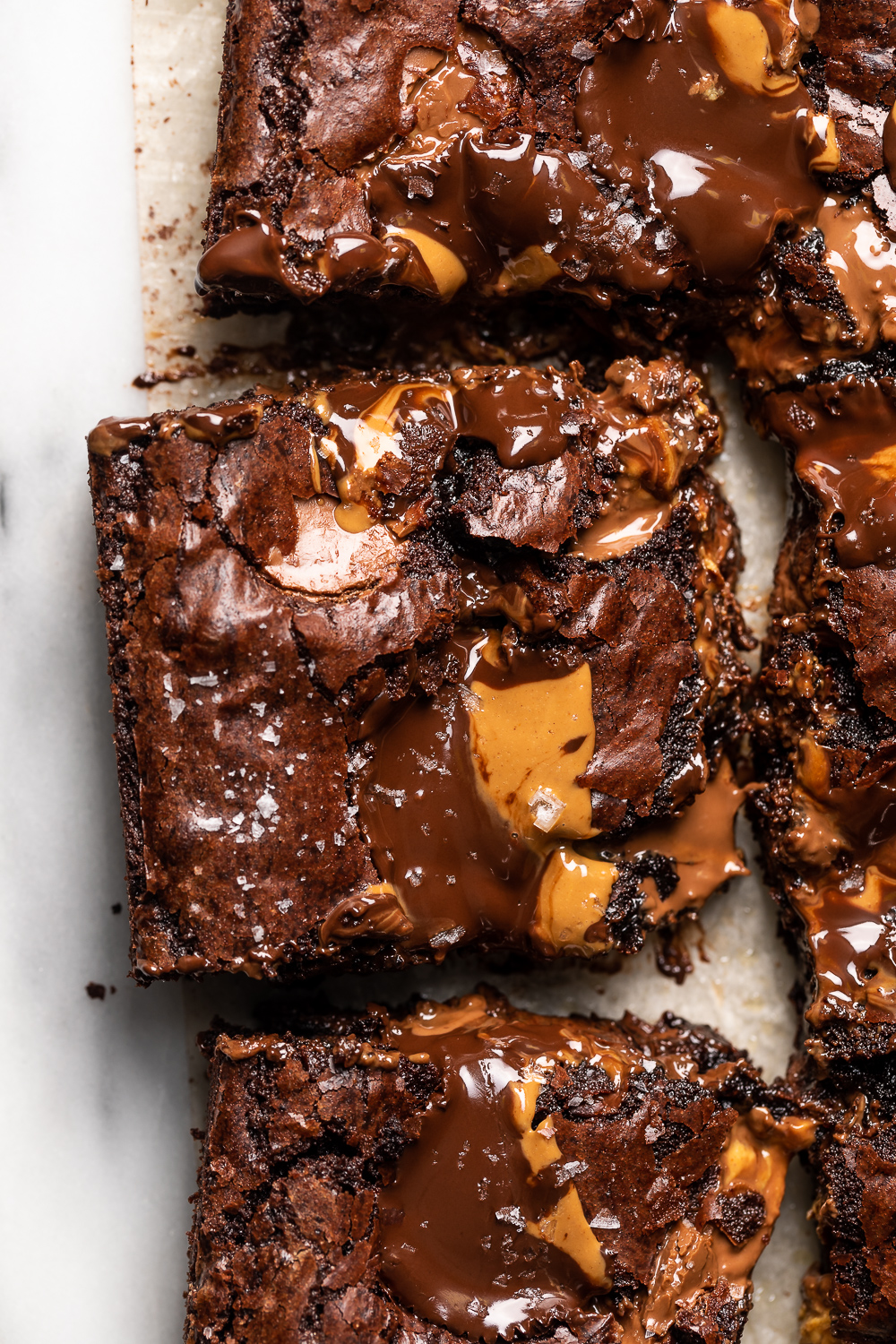 - Decorate your Brownies: Press peanut butter cups on top of the warm brownies! This is 100% optional but makes the brownies look irresistible and taste even more out of this world delicious. You could press some peanut butter chips on top, too. And sprinkle with flaky sea salt, if desired.