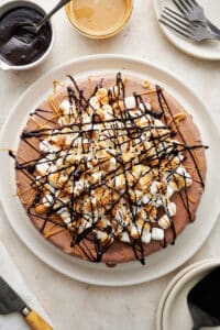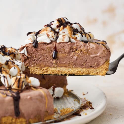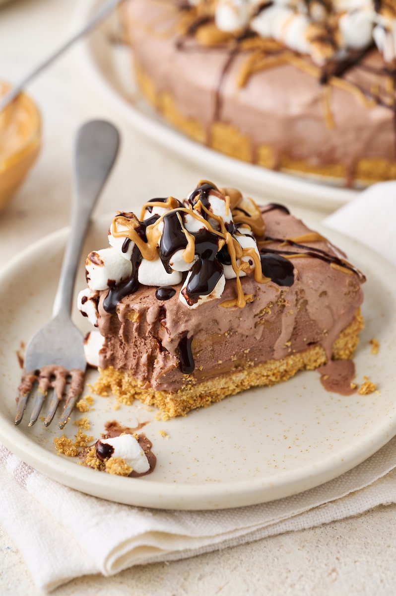 Peanut Butter S’mores Ice Cream Cake is the perfect no-bake summer dessert recipe! Featuring a crumbled graham cracker crust, peanut butter chocolate ice cream layer, and toasted marshmallows. It’s a s’mores lovers dream come true.