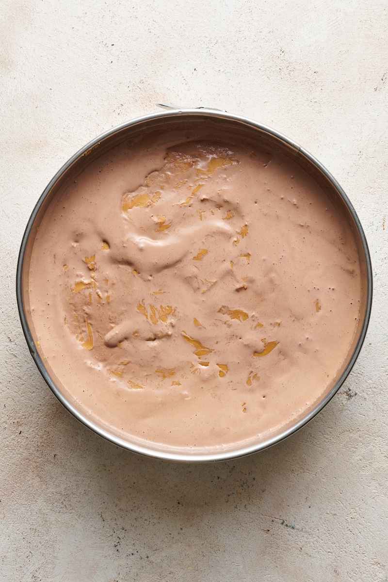 - Spoon the softened ice cream mixture on top of the prepared crust and spread evenly over the crust. Place the pan in the freezer and freeze until very firm, at least 4 hours, but preferably 6 to 8 hours.
