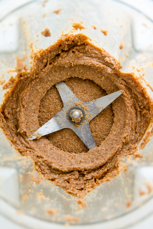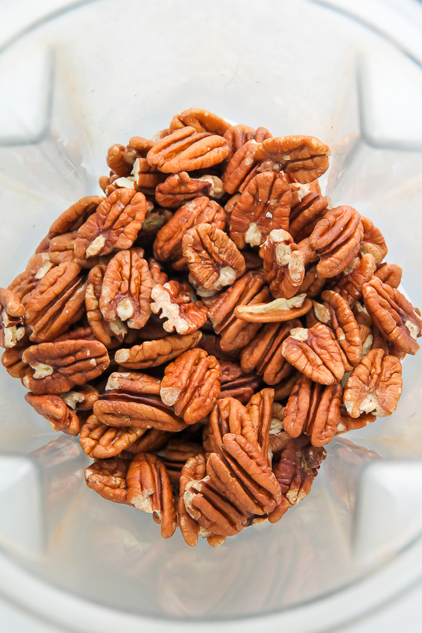 - Place the pecans in the bowl of a food processor (or very powerful blender) and pulse for 10-15 minutes, stopping occasionally to scrape down the sides with a spatula. The mixture is going to be quite grainy at first, but it will eventually blend into a very creamy mix. Just keep stirring and pulsing! It took me exactly 13 minutes, so it may take you more or less time depending on your appliance.