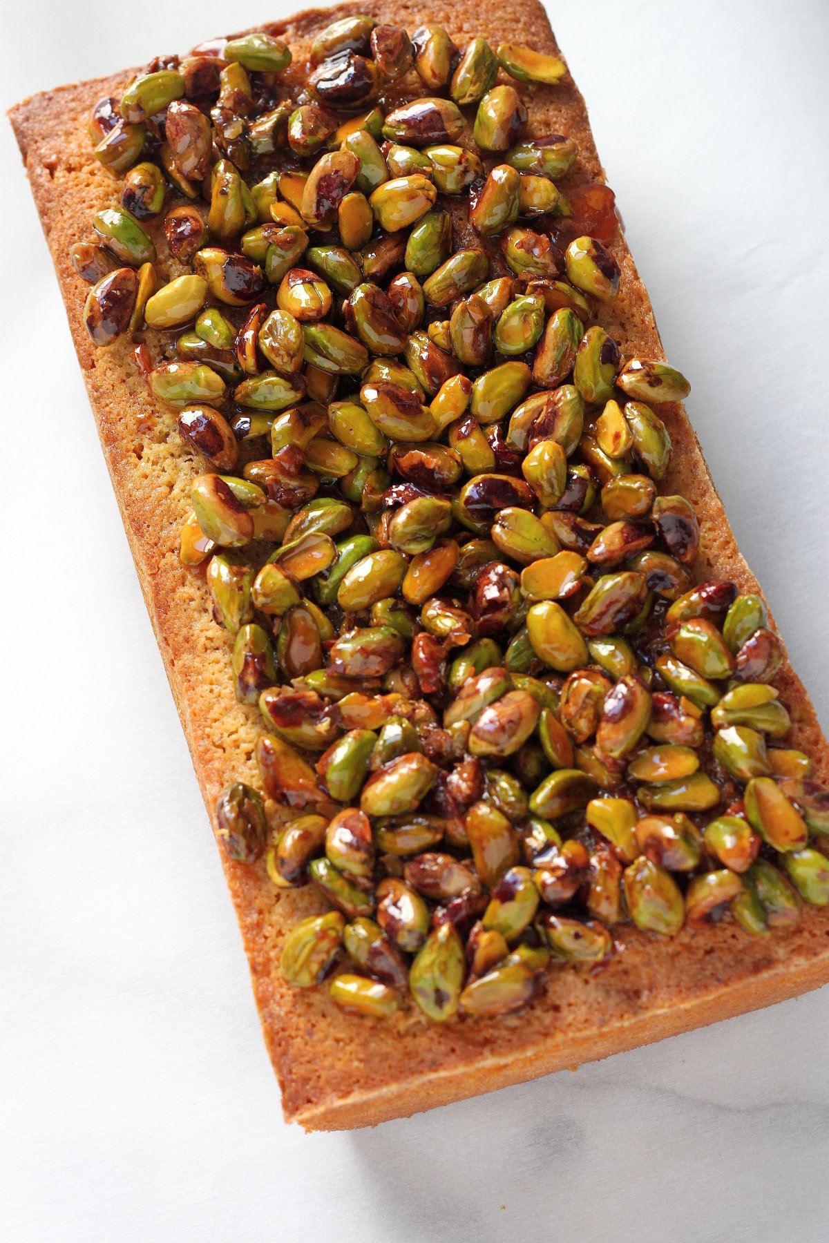 - Carefully pour the topping over the cake, allow the syrup to run down the sides, but keeping the pistachios nestled on top.