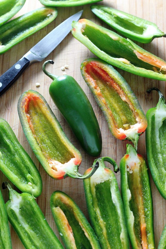 - Using rubber gloves, cut the jalapeño peppers in half lengthwise, remove all of the seeds inner membranes; set aside.