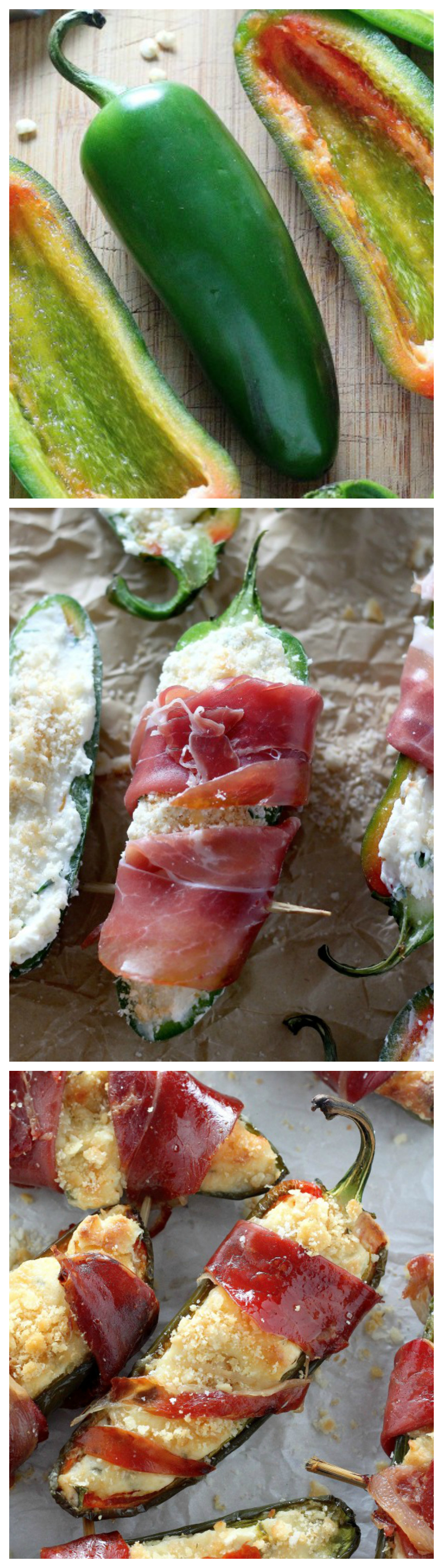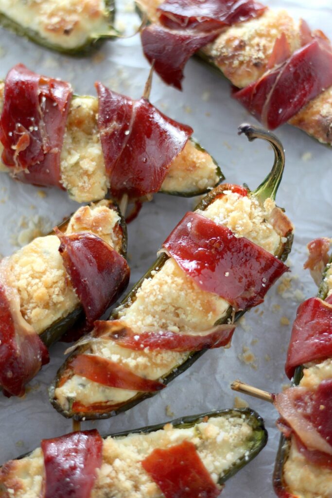 Prosciutto-Wrapped Four Cheese Stuffed Jalapeños! Oh man. I have such a weakness for these SUPER scrumptious, spicy, stuffed jalapeño peppers. Loaded with 4 cheeses, topped with a buttery cracker crumb, AND wrapped in Italian prosciutto – these are sure to be your new weakness, too.