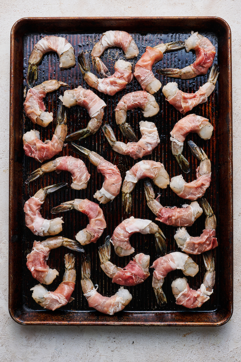 - Wrap a piece of prosciutto around each shrimp and secure it with a wooden toothpick.