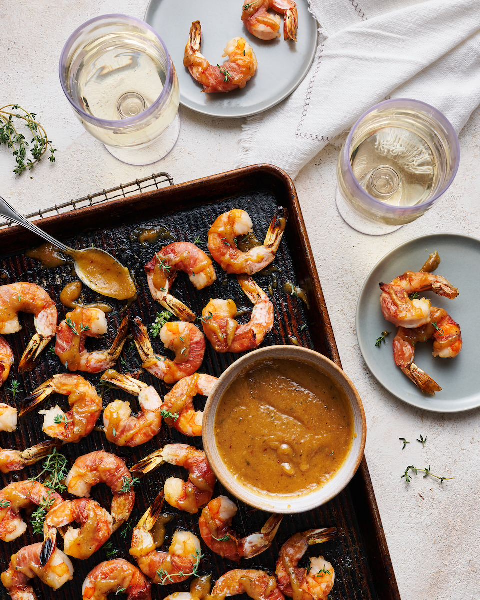 - Make the honey mustard sauce first! This is much more time consuming that the shrimp, and you’ll want it ready to go when the shrimp come out of the oven. You can pour it into a medium bowl and cover it with foil until needed.