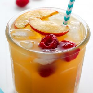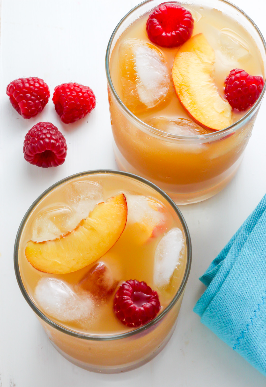 Sweet peach puree, red raspberries, black tea, and fresh squeezed lemonade all mixed up in one cold, cool, and utterly refreshing Summertime beverage… why didn’t I think of this one sooner?!