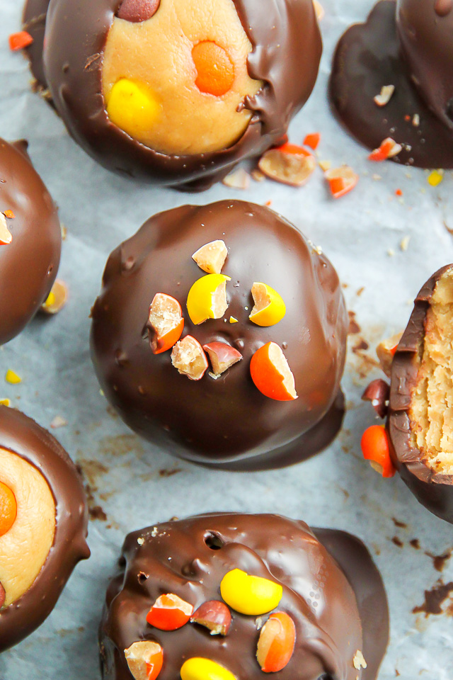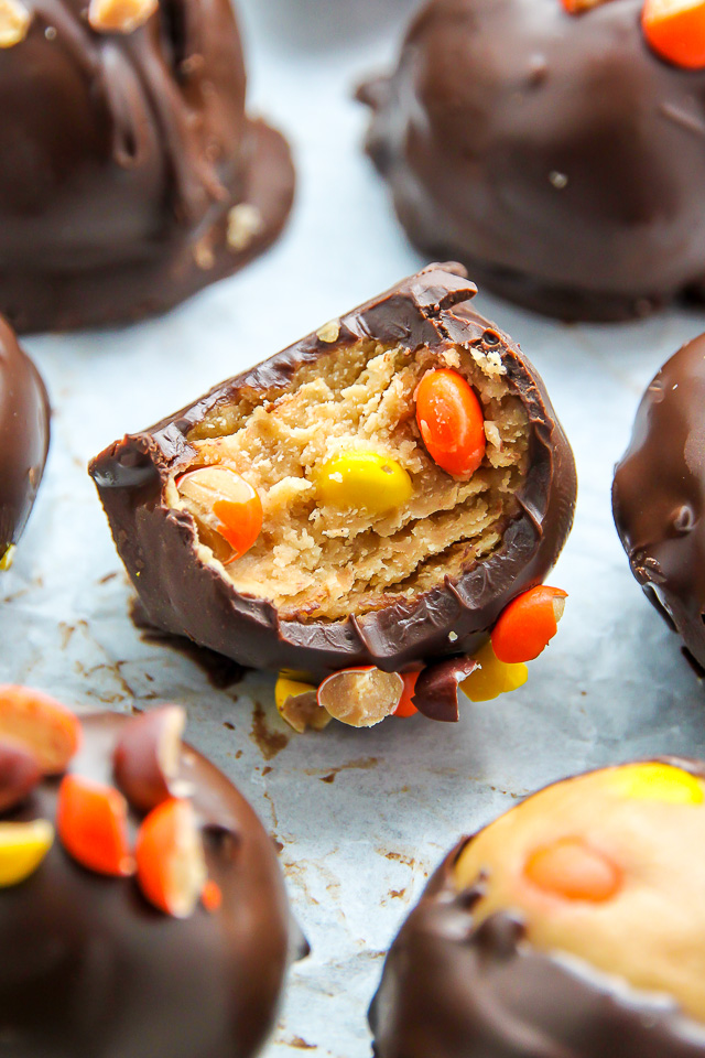 Creamy and crunchy chocolate peanut butter truffles loaded with mini Reese’s pieces.