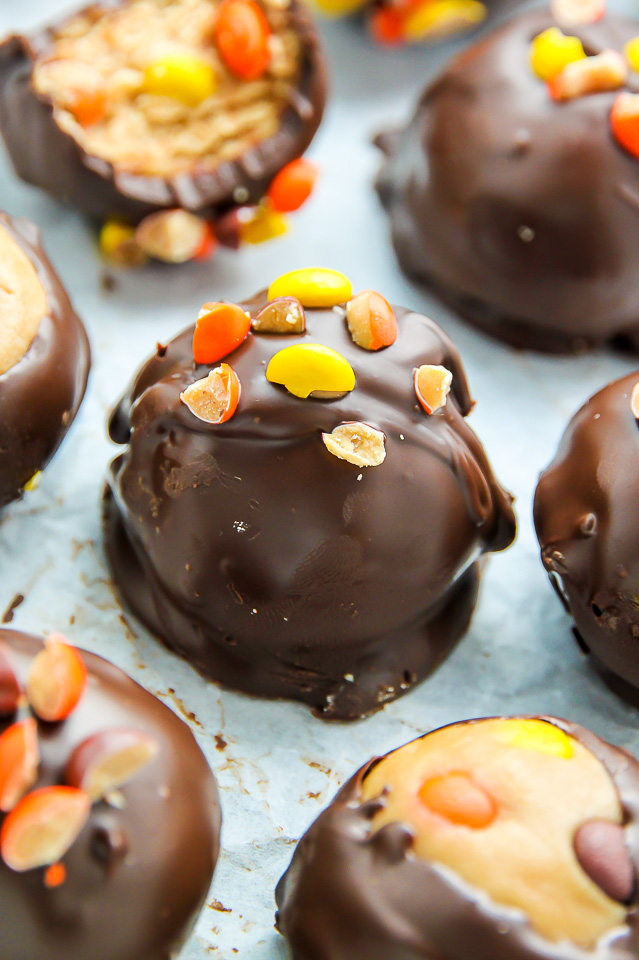 - Remove peanut butter balls from freezer. One at a time, carefully dip each chilled ball in the melted chocolate. When lifting the peanut butter ball out of the chocolate remember to allow excess chocolate to drip back into the bowl. Transfer the chocolate covered balls back to parchment paper lined baking sheet after dipping each one. Sprinkle the tops of the wet chocolate with remaining Reese's pieces.