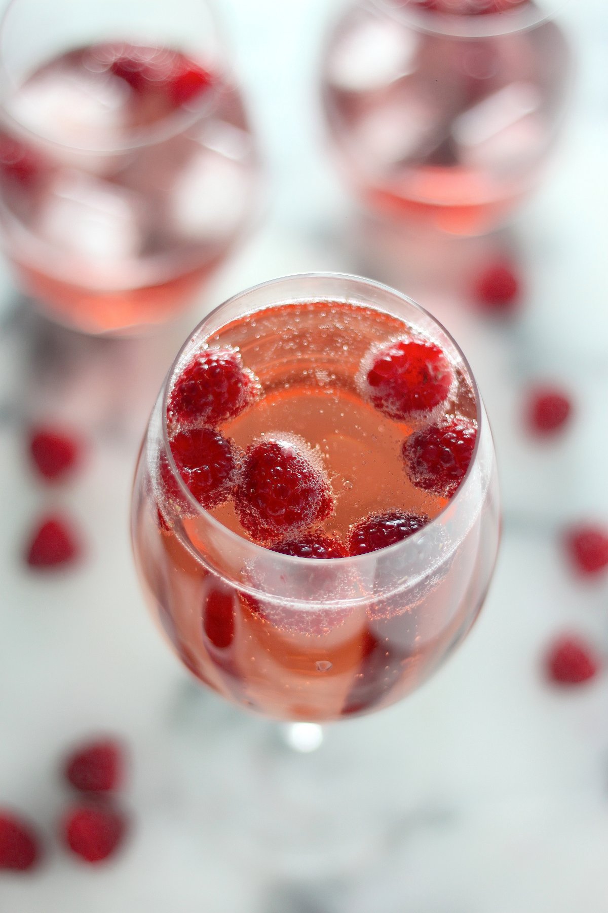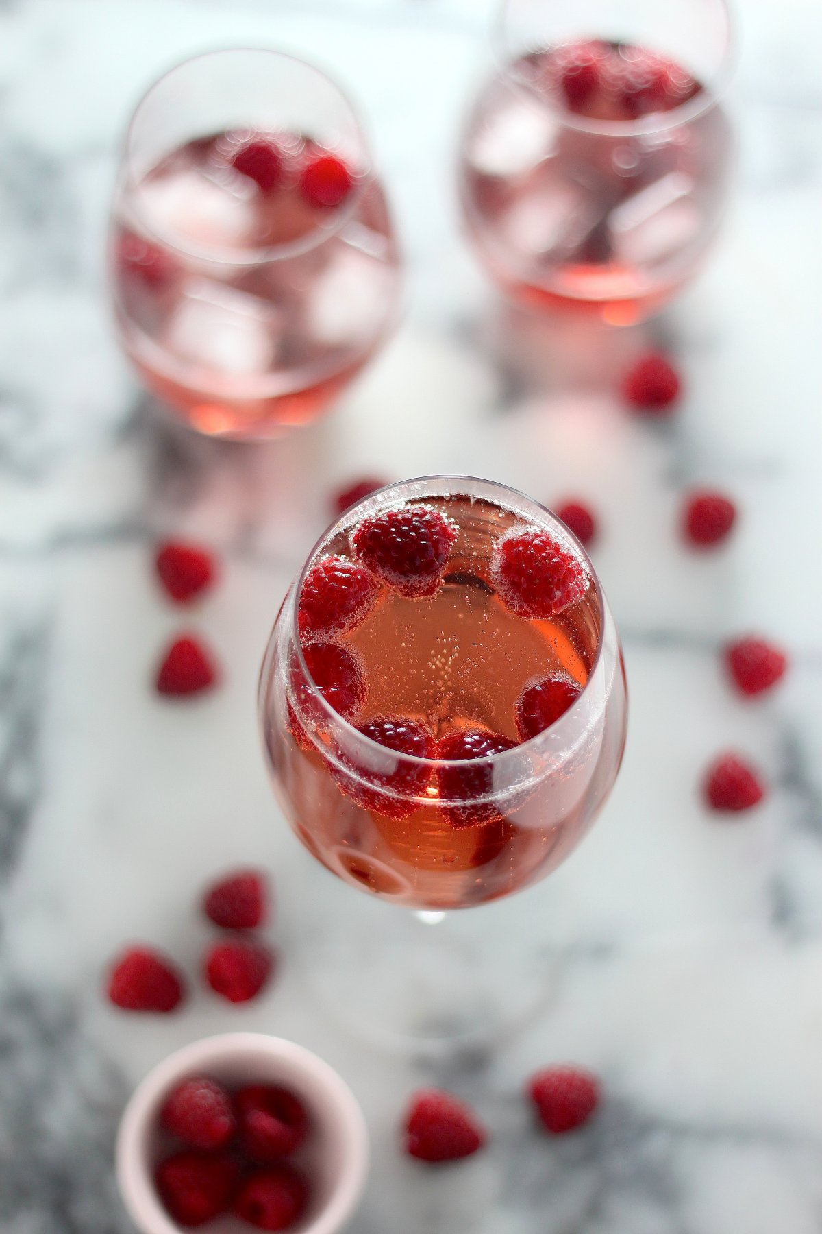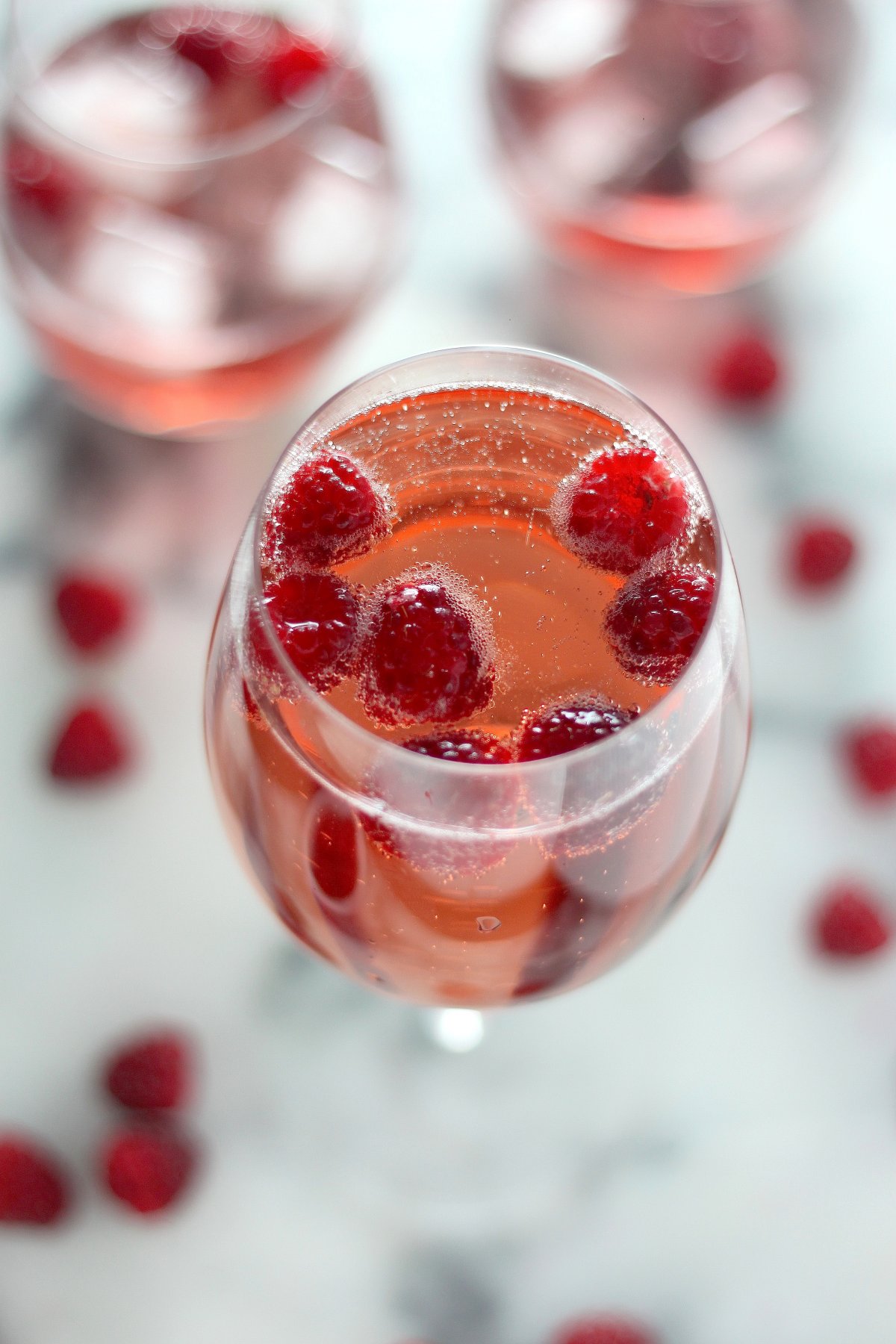 These pretty fizzy champagne drinks call for just two ingredients, but I recommend grabbing fresh raspberries, making it three. But still, not bad, right?! Also, no martini shaker needed. Thank the lord for less dishes!