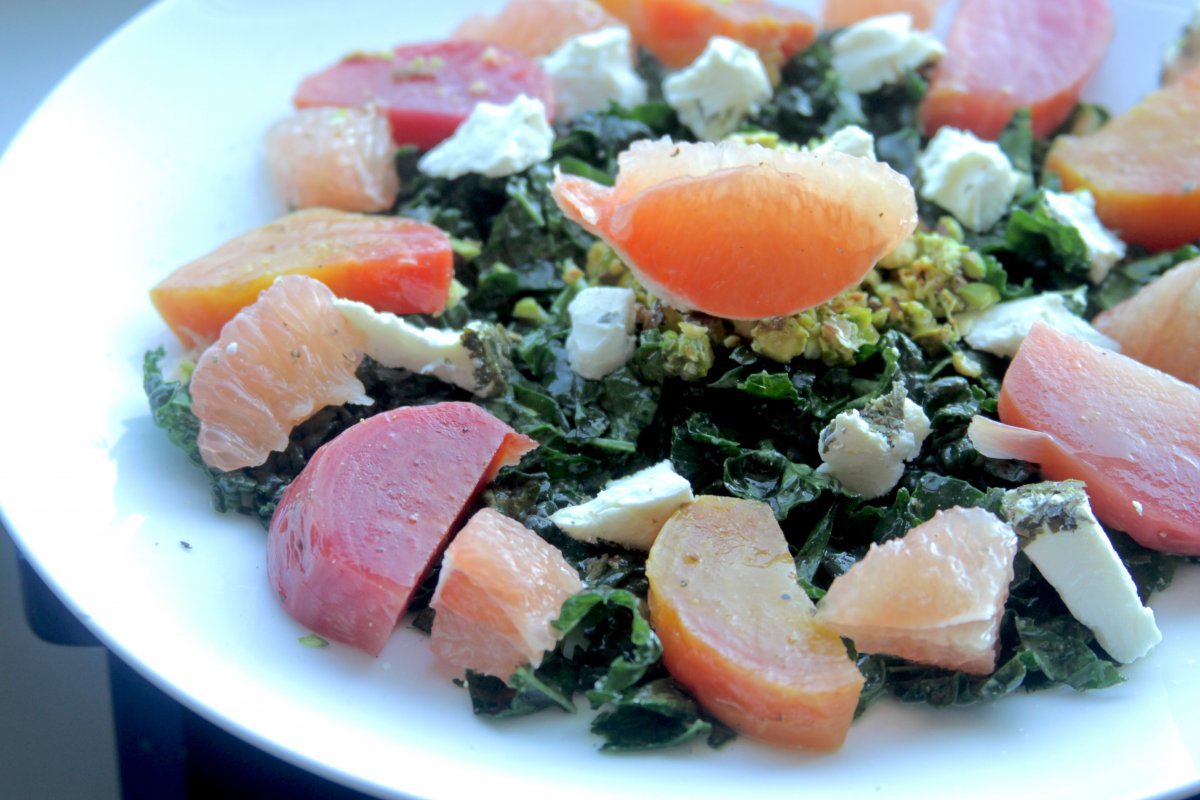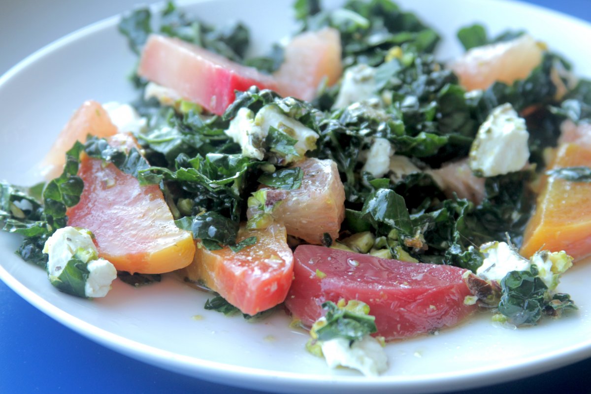Raw kale chiffonade, crushed pistachios, sliced grapefruit, and goat cheese are the finishing touches on this salad beauty. Wait till you combine everything: It’s stunning!
