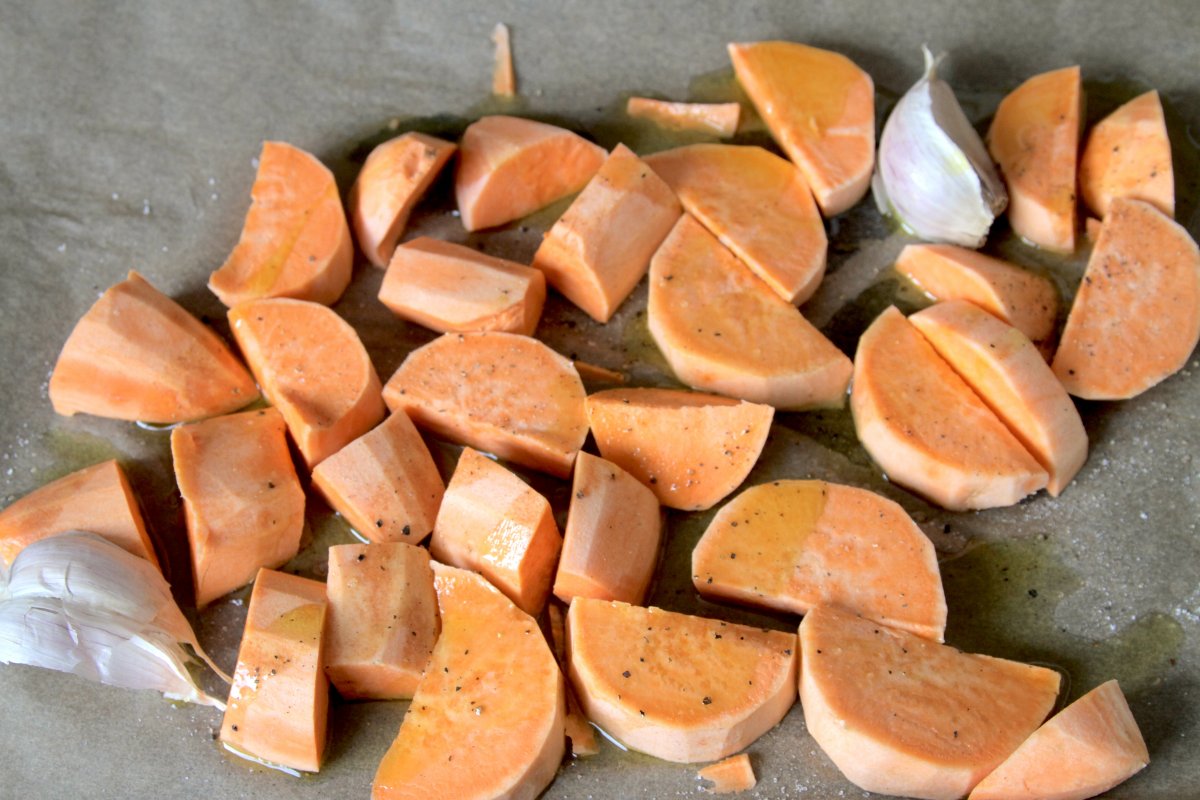 Preheat oven to 400 degrees (F). Place chopped sweet potatoes on a parchment paper lined baking sheet and drizzle with 3 tablespoons of the olive oil. Sprinkle with salt and pepper and roast for 20 minutes. Flip the potatoes and add the unpeeled garlic cloves to the baking sheet before returning to the oven for another 20 minutes. Once the potatoes are golden and very soft, remove from the oven and let cool at least 5 minutes. With a fork, potato masher, or electric mixer mash the potatoes and garlic until they’re completely pureed. Reduce oven heat to 350 degrees (F).