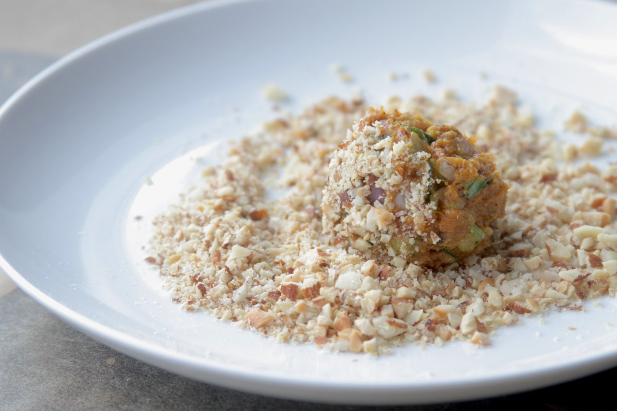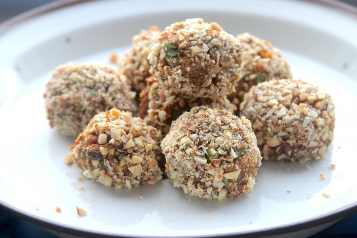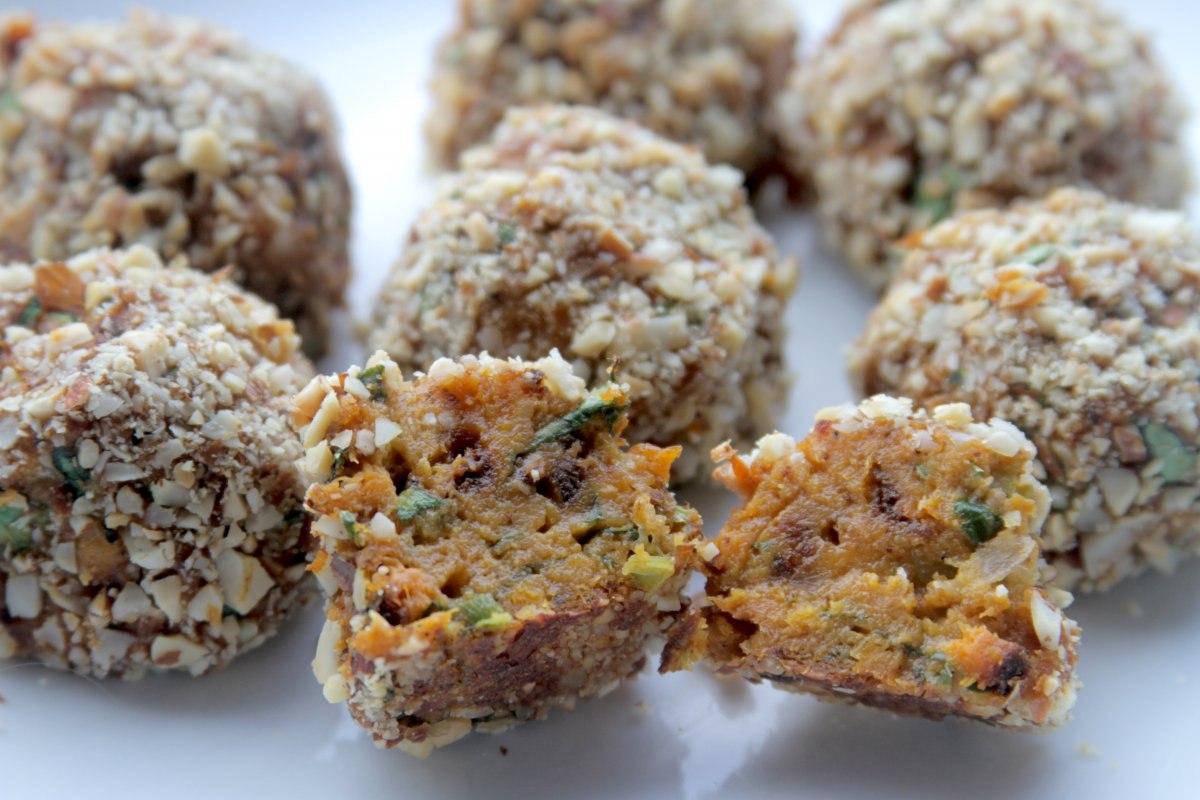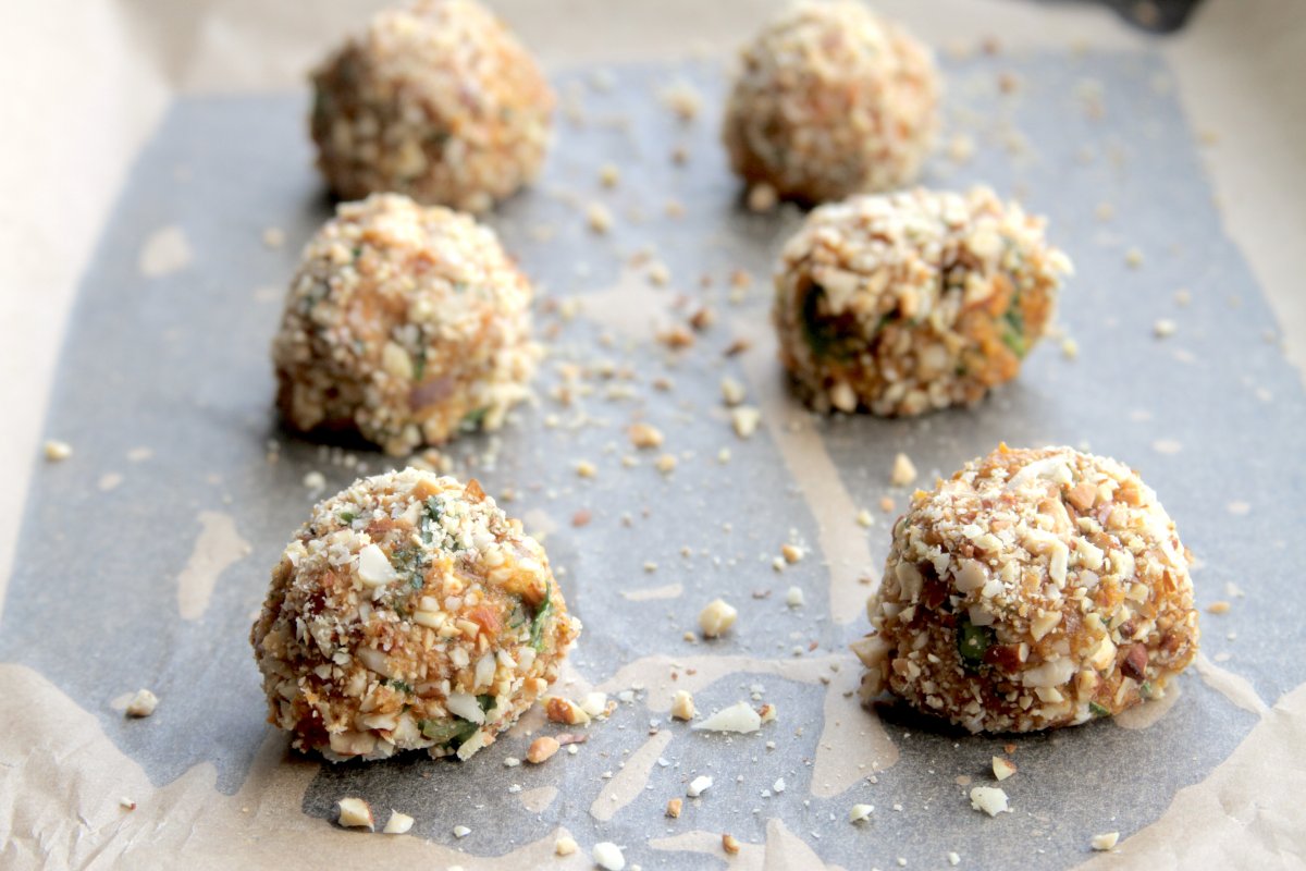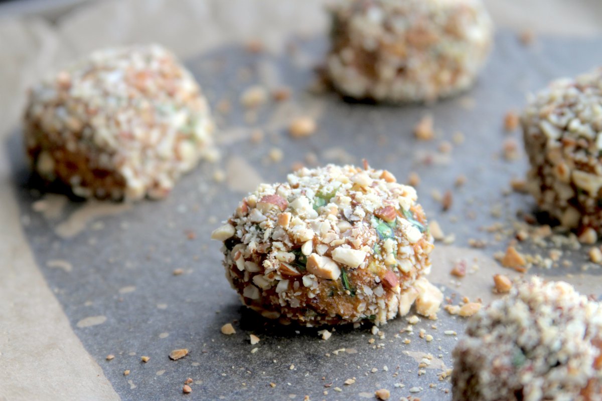 Spread the chopped nuts out on a large plate. Spoon out tablespoon sized balls of the potato mixture and gently roll in the nuts, before placing them on a parchment paper lined baking sheet. Bake for about 25 minutes, and serve immediately.